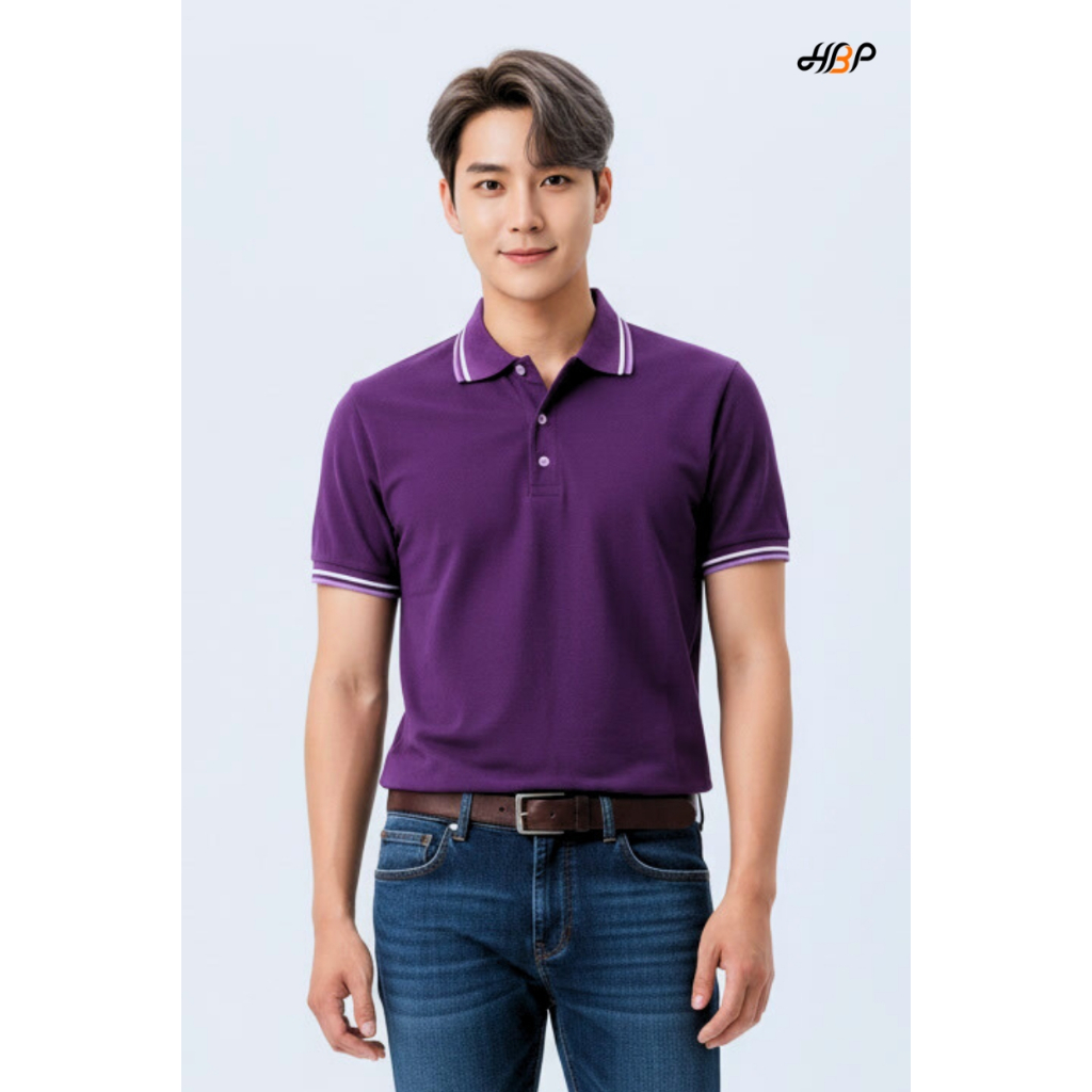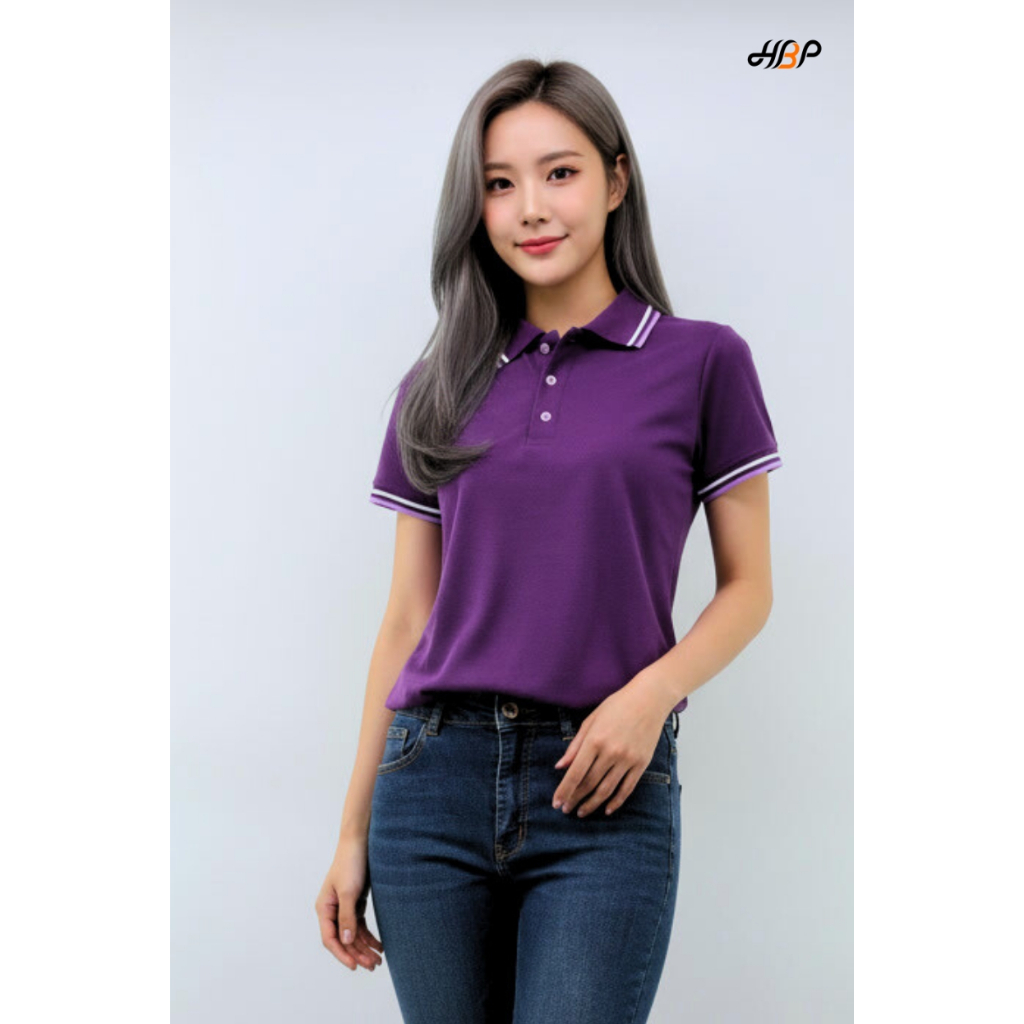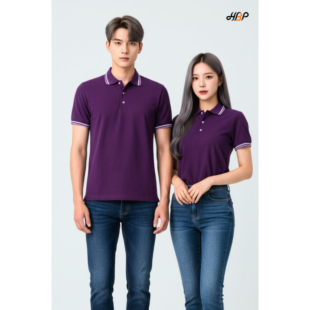 เสื้อโปโลสีม่วงเข้มขลิบม่วงอ่อน ขาว แขนจั้ม เนื้อผ้า TK
