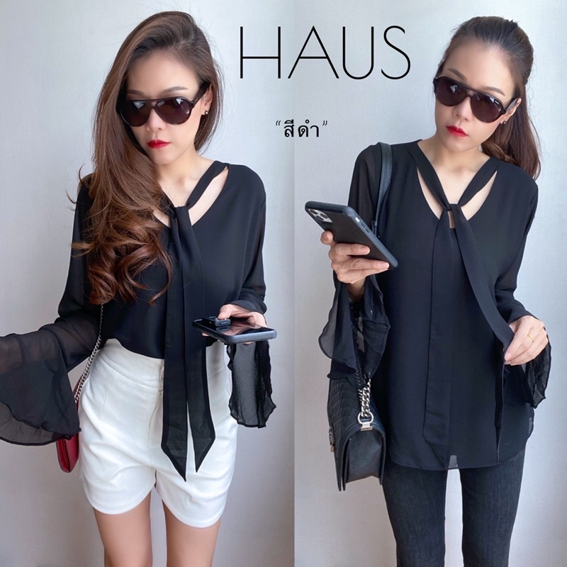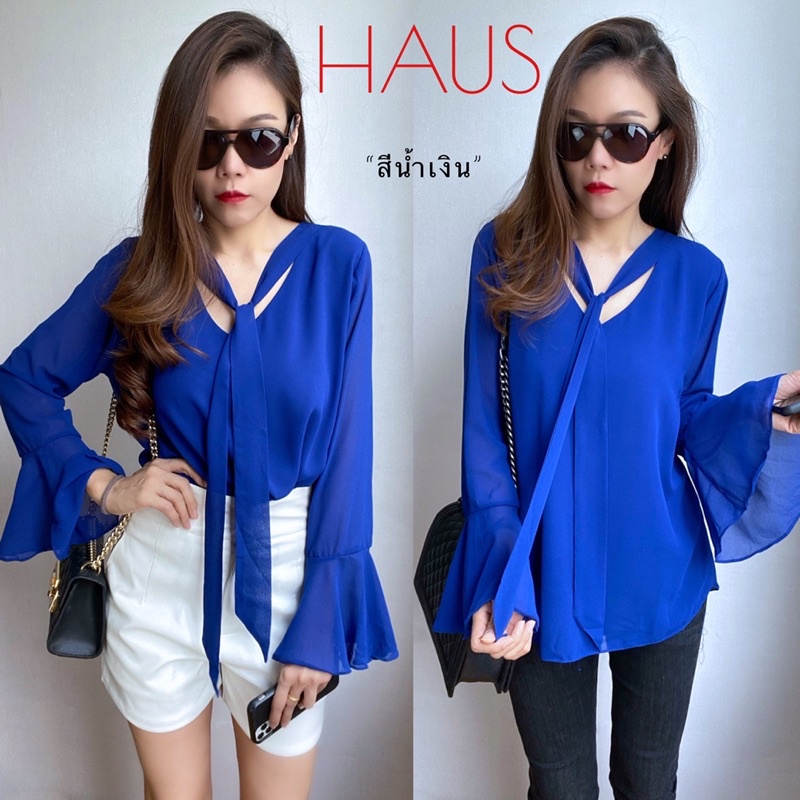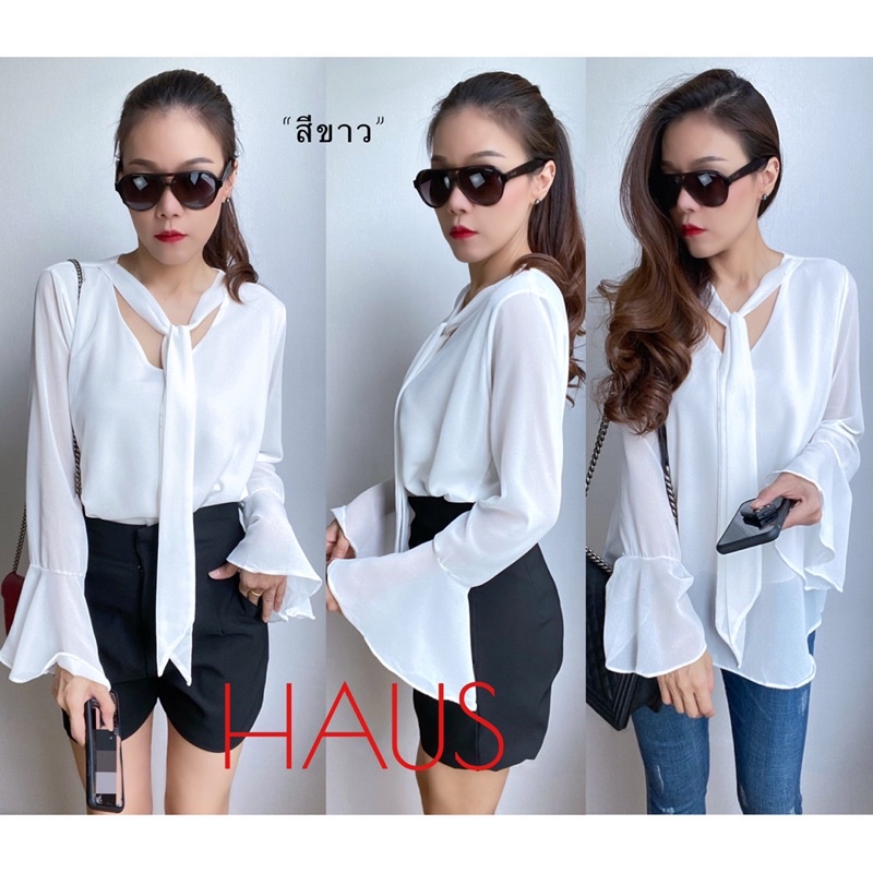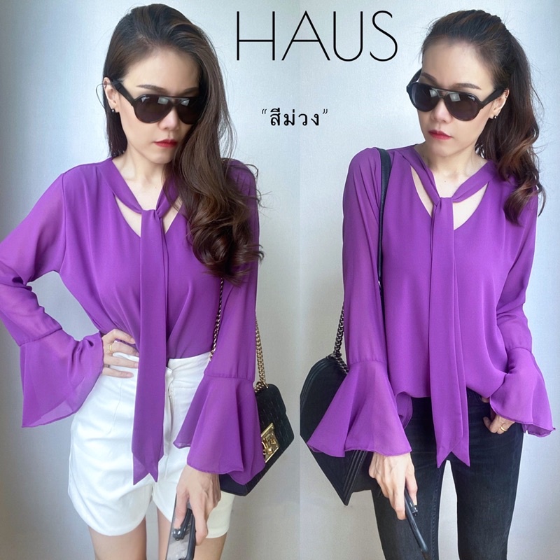 เสื้อชีฟองแขนยาวคอวีแต่งสายผูกเองตรงคอแขนทรงแขนกระดิ่ง oversize มีซับในผ้าชีฟองทั้งด้านหน้าแล้วหลัง รอบอกได้ถึง46”