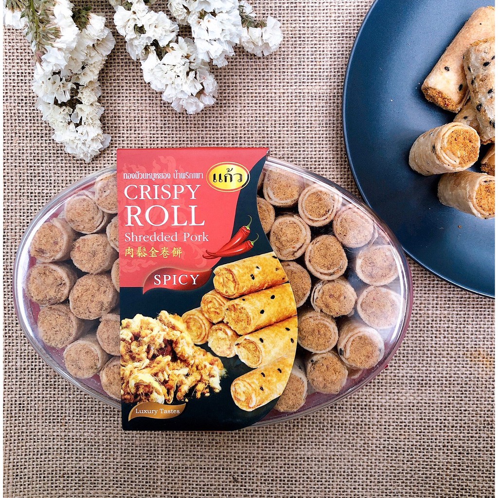 แก้ว ทองม้วนหมูหยอง รสพริกเผา กล่องใหญ่ ขนาด 340 กรัม ( ของฝาก กาญจนบุรี ขนมไทย ขนมกรุบกรอบ ขนมกินเล่น )