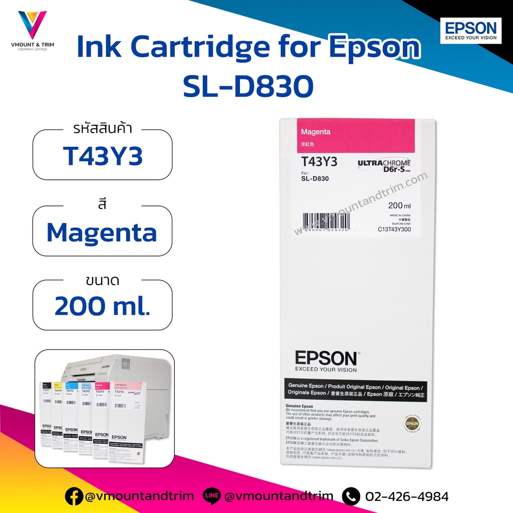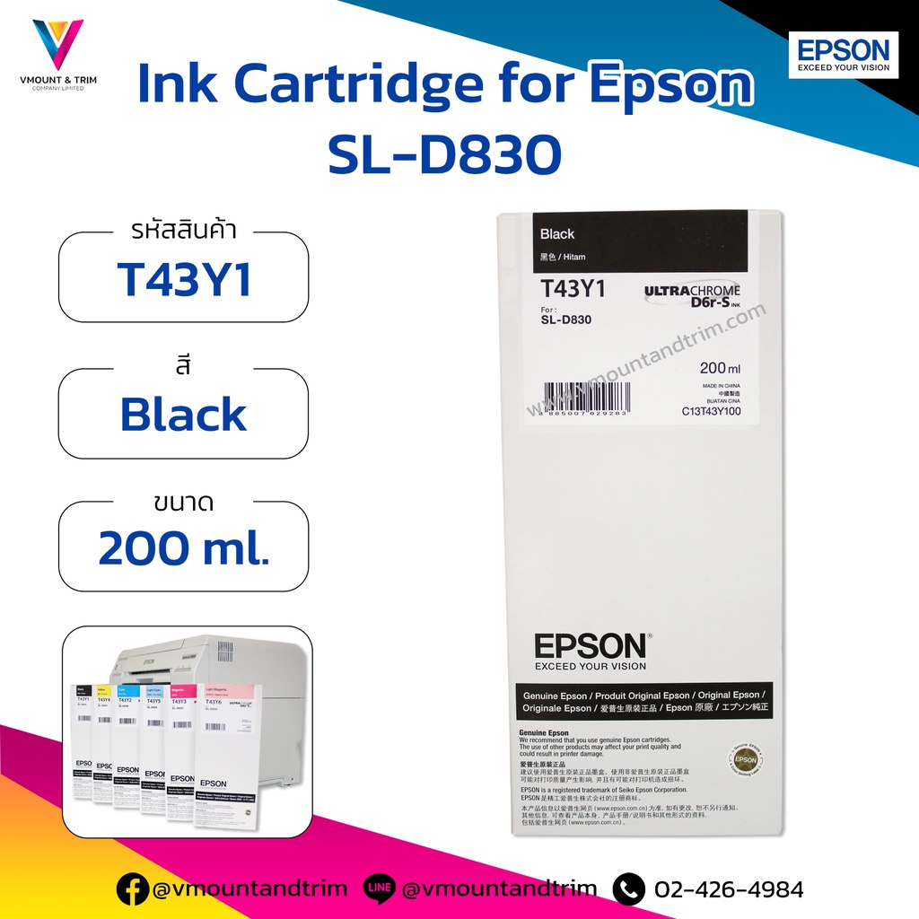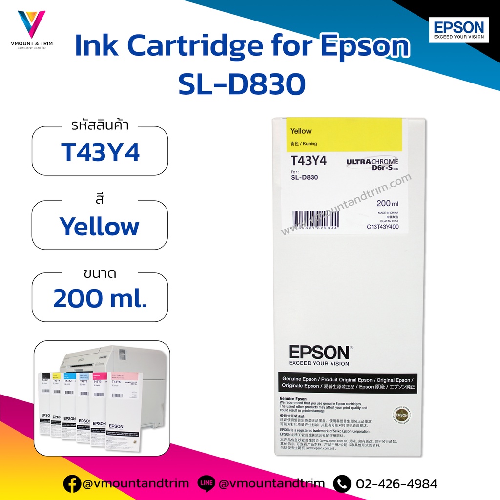 ตลับหมึกเอปสัน สำหรับ Epson SL-D830 200 ml. T43Yx ของแท้ นำเข้าโดยเอปสัน (ประเทศไทย)