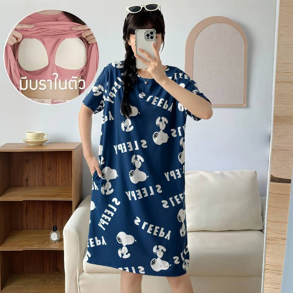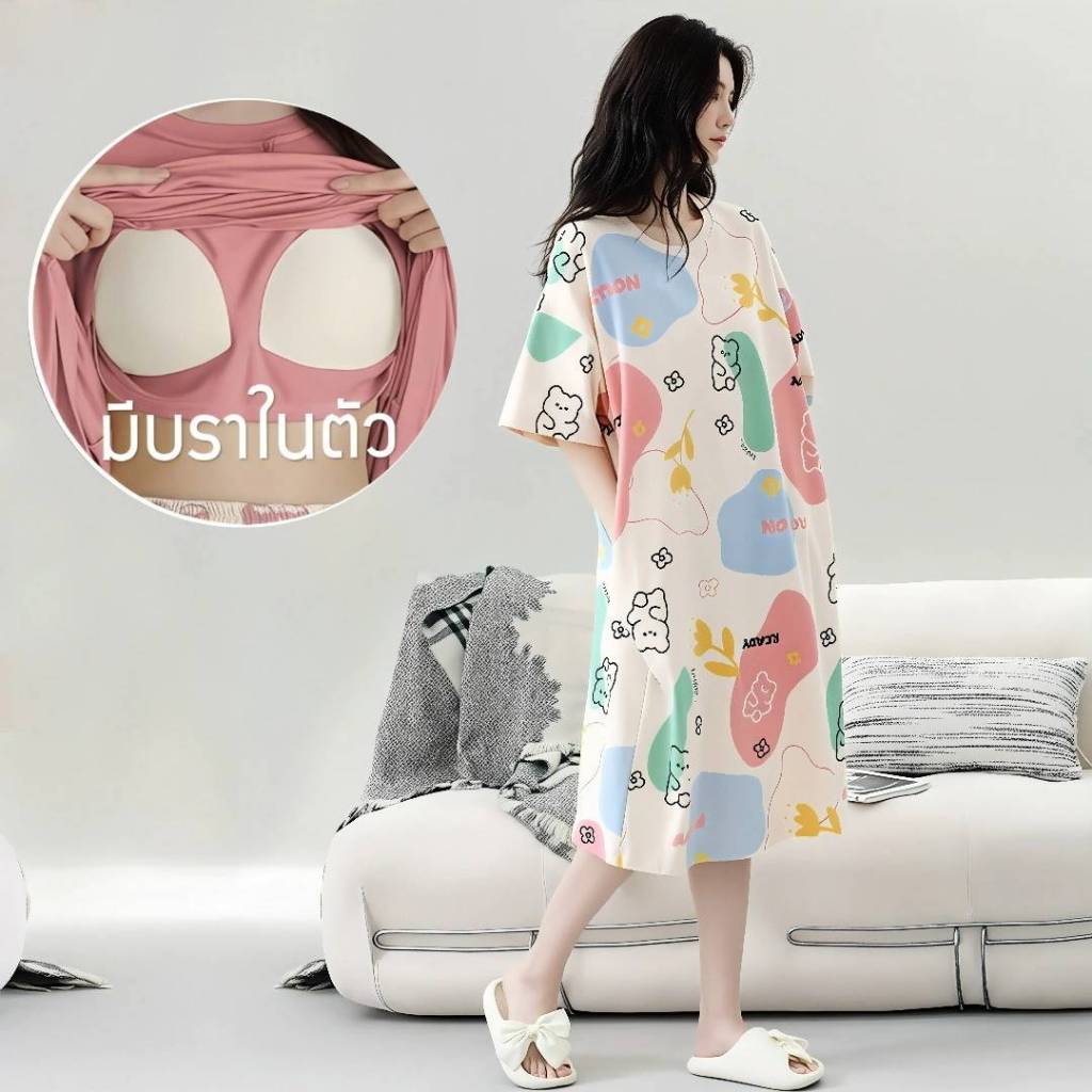 ชุดนอนกระโปรงมีซับในพร้อมกระเป๋า ชุดนอนแขนสั้นฟรีไซส์ งานใส่สบาย ผ้านิ่มไม่บาง DE