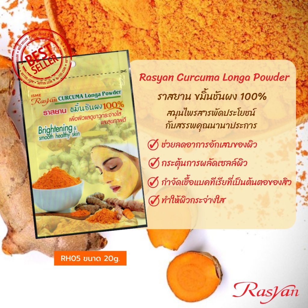 ขมิ้นชันผง 20 กรัม | ผ่านการฉายรังสีฆ่าเชื้อแล้ว | ขมิ้น ผง 100% Rasyan ราสยาน สมุนไพร ขัดผิว พอกผิว