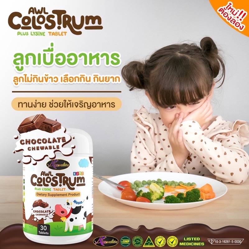 นมเม็ด AWL 𝐂𝐨𝐥𝐨𝐬𝐭𝐫𝐮𝐦 𝐏𝐥𝐮𝐬 𝐋𝐲𝐬𝐢𝐧𝐞 สำหรับเด็ก ทานง่าย รสช็อกโกแลต กลิ่นหอม เด็กๆชอบ