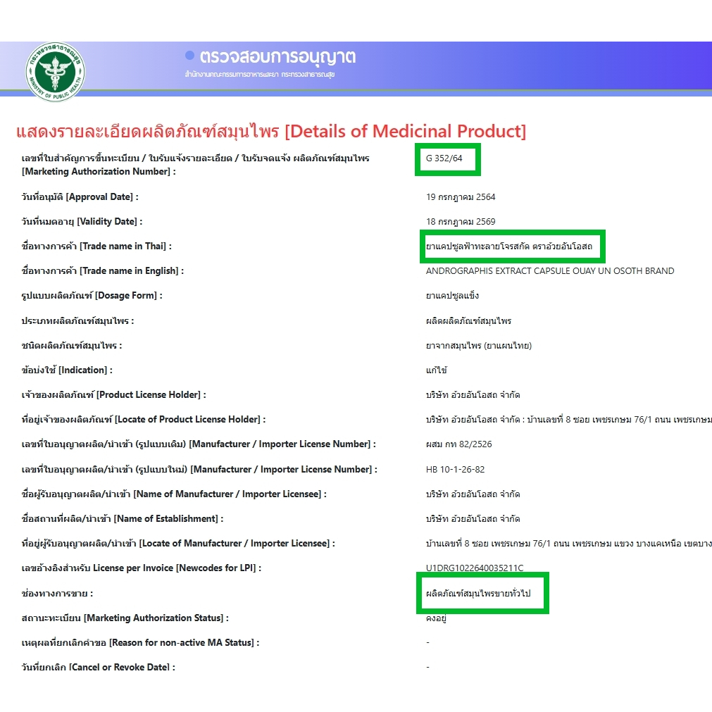 อ้วยอันโอสถ ยาแคปซูลฟ้าทะลายโจรสกัด แอนโดรกราโฟไลด์ 20 มก. ตราอ้วยอันโอสถ (45 แคปซูล)