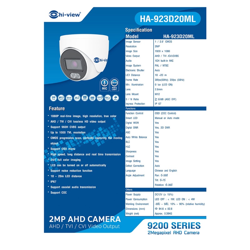 Hi-view กล้องวงจรปิด Dome Camera รุ่น HA-923D20ML คมชัด 2ล้านพิกเซล ภาพสี 24 ชั่วโมง บันทึกเสียง