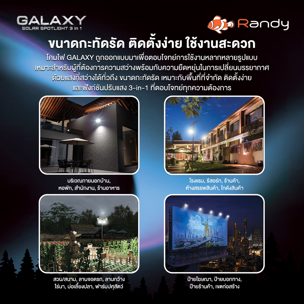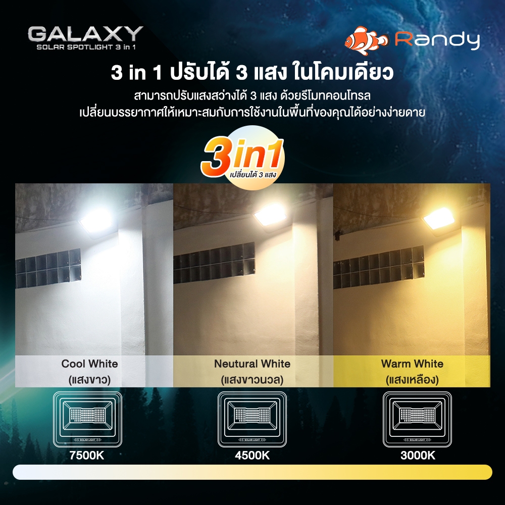 ⚡ใหม่ล่าสุด!! RANDY รุ่น Galaxy ไฟสปอตไลท์โซล่าเซลล์ ปรับได้ 3 แสง สว่าง คุ้มค่า มาตรฐานสากล ไม่ต้องเดินสาย