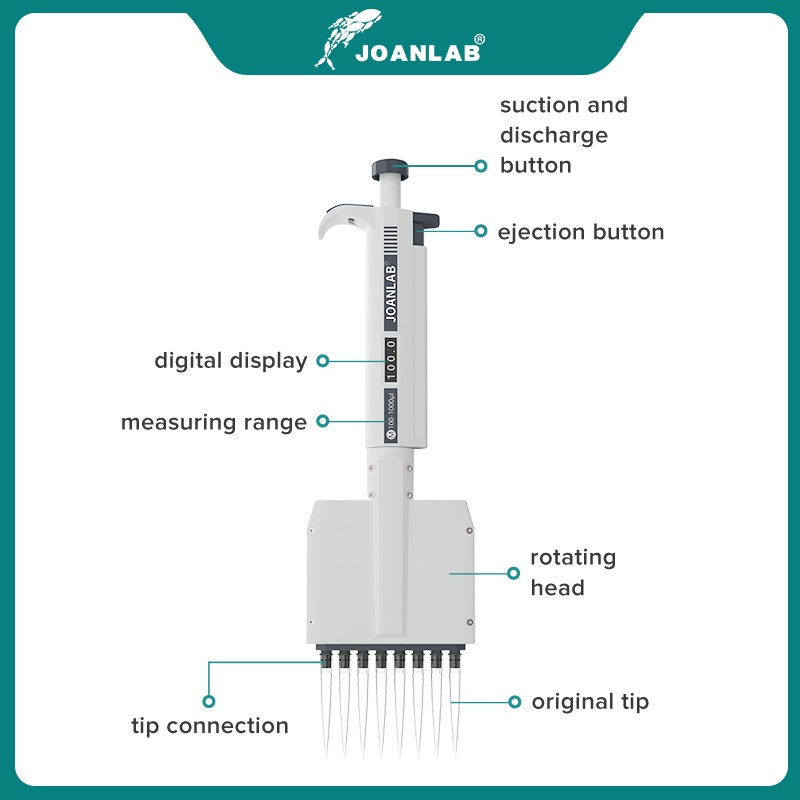 Joanlab อุปกรณ์ห้องปฏิบัติการปิเปตหลายช่องทาง ไมโครปิเปตแบบปรับได้แบบดิจิตอล 8 ช่องปิเปต 12 ช่อง