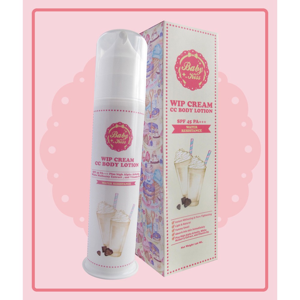 ⚡พร้อมส่ง⚡ซีซีครีมทาตัว Baby Kiss Wip Cream CC Body Lotion กันแดด SPF45 กันน้ำ กันเหงื่อ ไม่ติดขน ผิวขาวธรรมชาติ