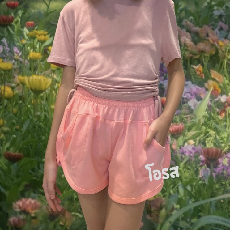Yui กางเกงขาสั้นเด็กผู้หญิง อายุ 3-14 ปี "กุ้นสีตัวมีกระเป๋า" ผ้า Cotton เอวยางยืด