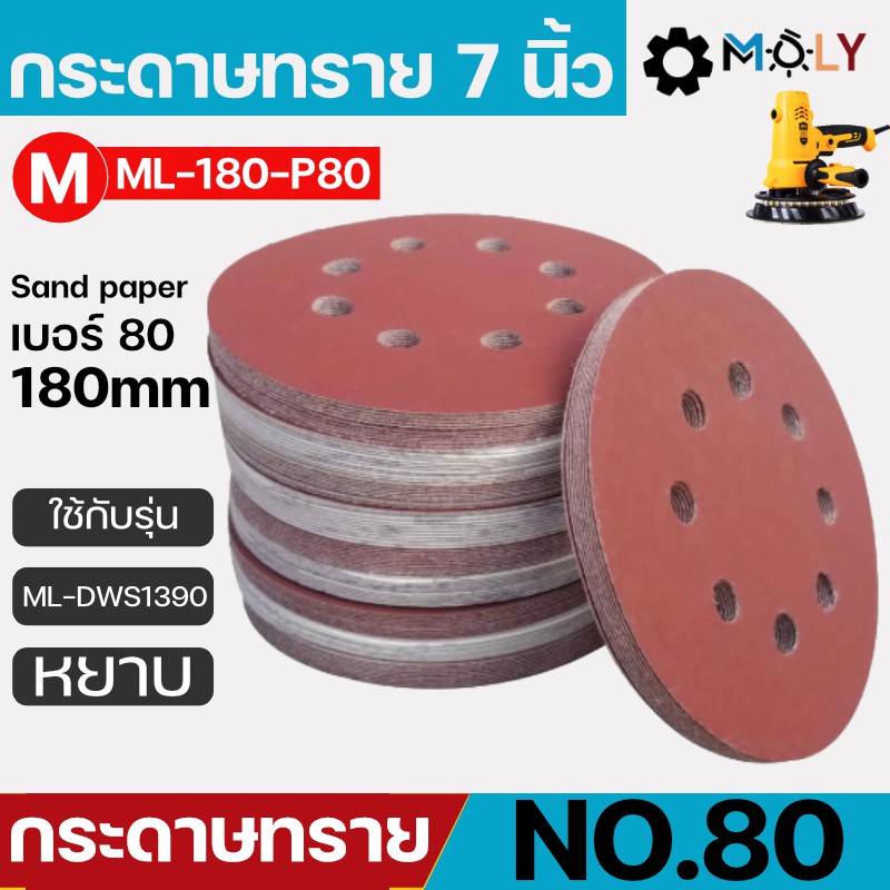 Moly Toos กระดาษทรายเครื่องขัดผนัง สกิมโค้ท หน้างกว้าง 7นิ้ว 180mm. ML-180-P80 เบอร์80 50แผ่น