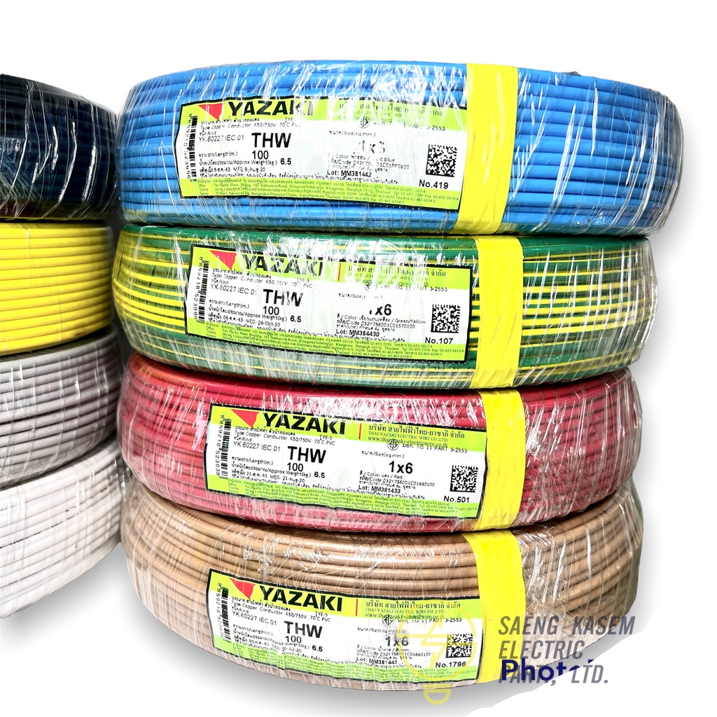 ราคารวมVAT❗️สายไฟ สายเดี่ยว THW THAI YAZAKI 1x6 sqmm ยาว 100 เมตร มีทุกสี