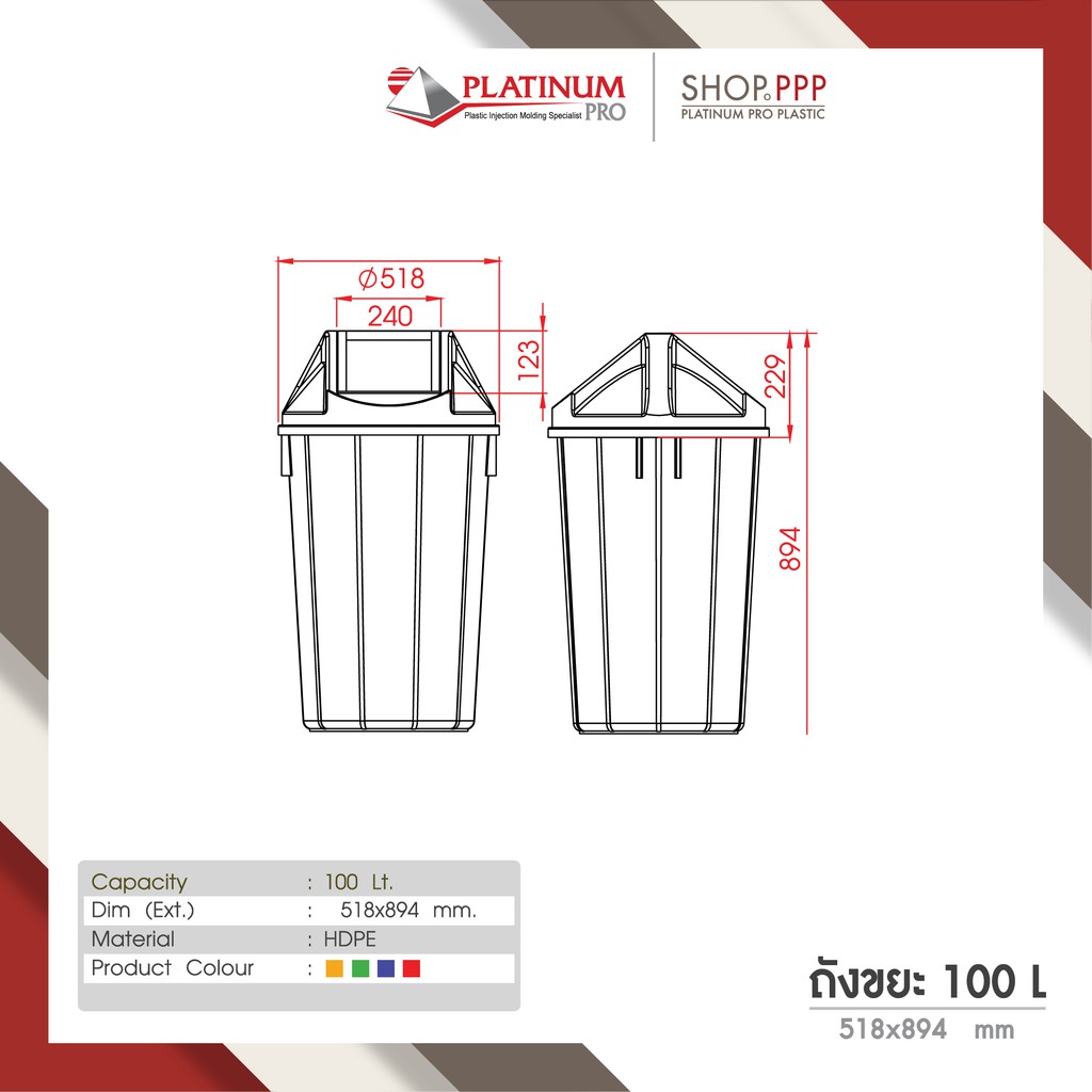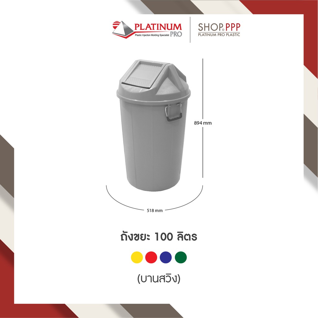 ถังขยะ 100 ลิตร บานสวิง สกรีนแยกขยะมาตราฐาน 518 x 894 mm.