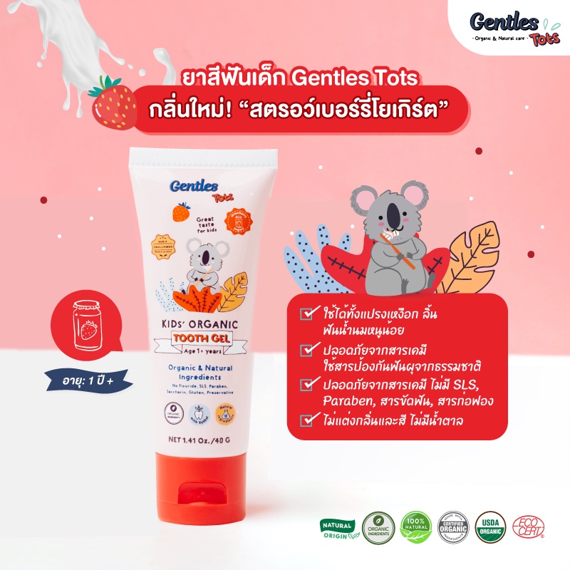 Gentles Tots ยาสีฟันเด็ก ออร์แกนิค กลืนได้ ปลอดภัย ยาสีฟันอร่อย สูตร Kids สำหรับ 1ปี+ (กลิ่นสตรอเบอรี่โยเกิร์ต)