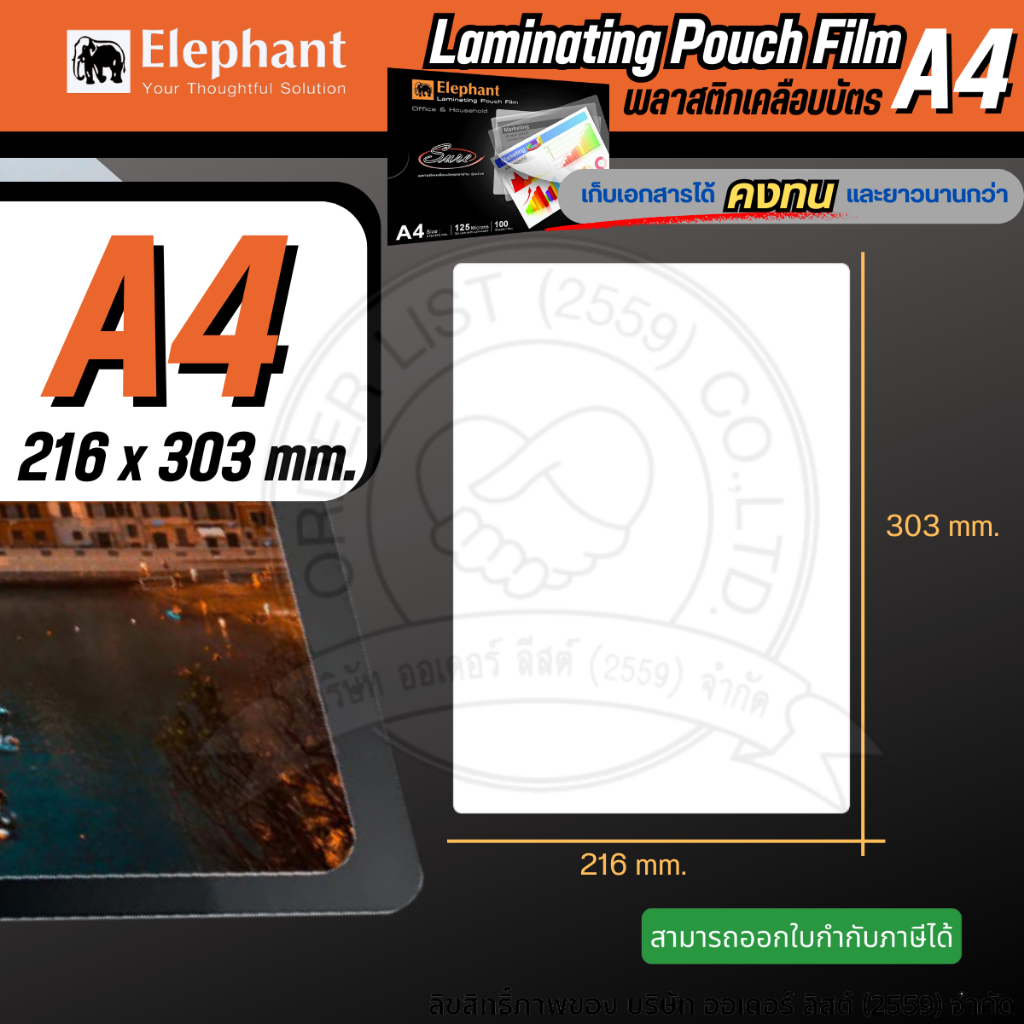 [ออกใบกำกับภาษีได้] ตราช้าง พลาสติกเคลือบบัตร A4 125 ไมครอน (100 แผ่น/กล่อง) รุ่น Sure