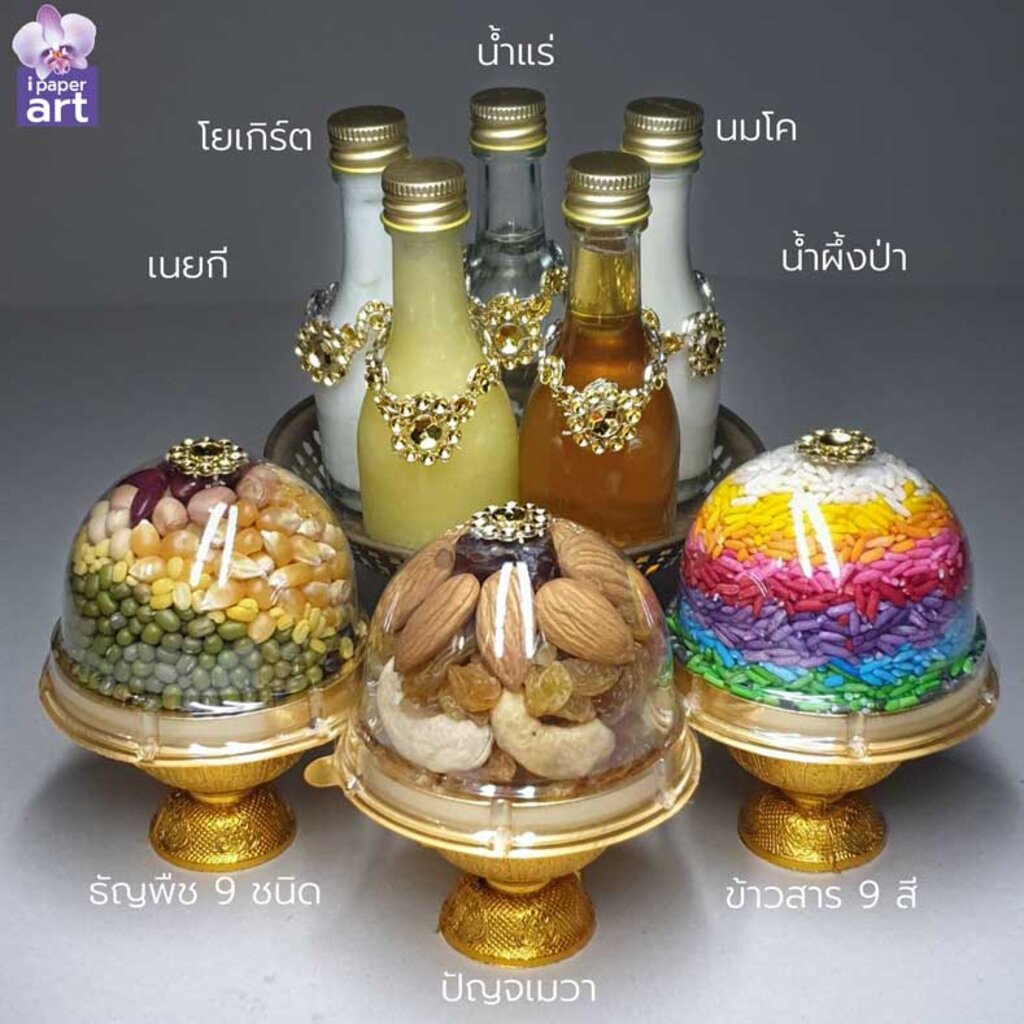 ชุดน้ำไหว้พระพิฆเนศ พระแม่อุมา พระแม่ลักษมี | ปัญจอมฤต-น้ำวิเศษทั้ง 5 | ขวดแก้วทรงสูง