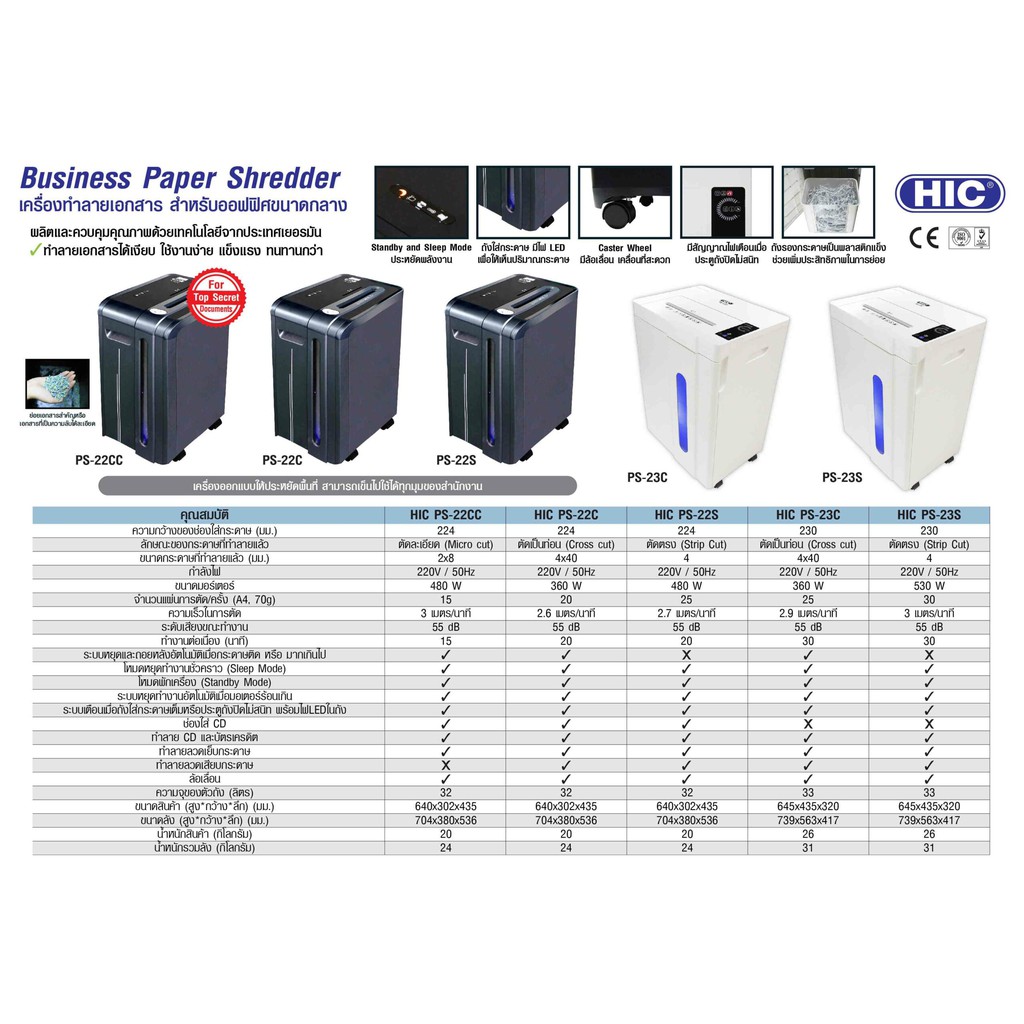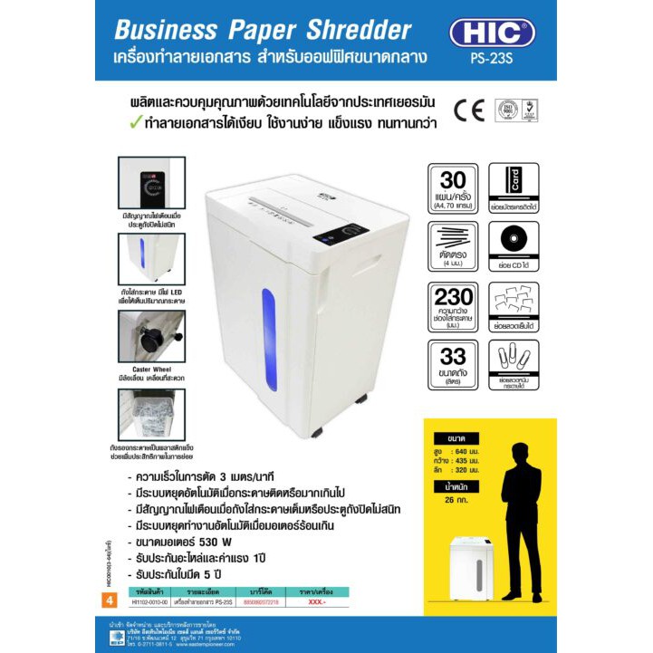 HIC เครื่องทำลายเอกสาร รุ่น PS-23S ตัดตรง (Strip cut) กว้าง 4 มม.