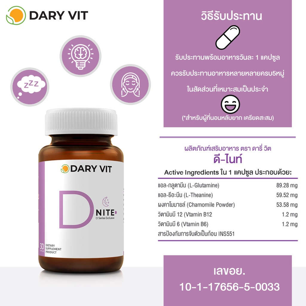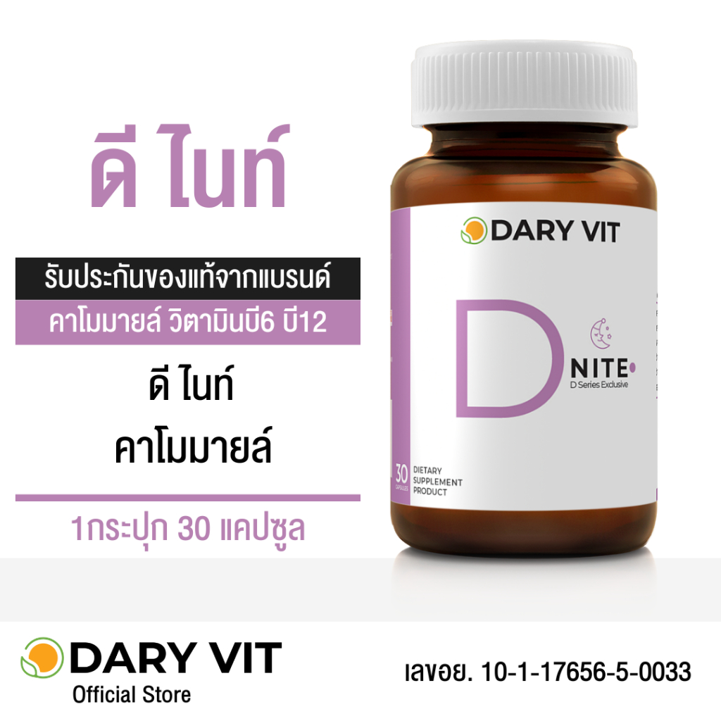 Dary Vit D Nite ดารี่ วิท ดีไนท์ อาหารเสริม สารสกัดจาก ดอกคาโมมายด์ แอลกลูตามีน แอลธีอะนีน วิตามินบี12 วิตามินบี6 ขนาด 3