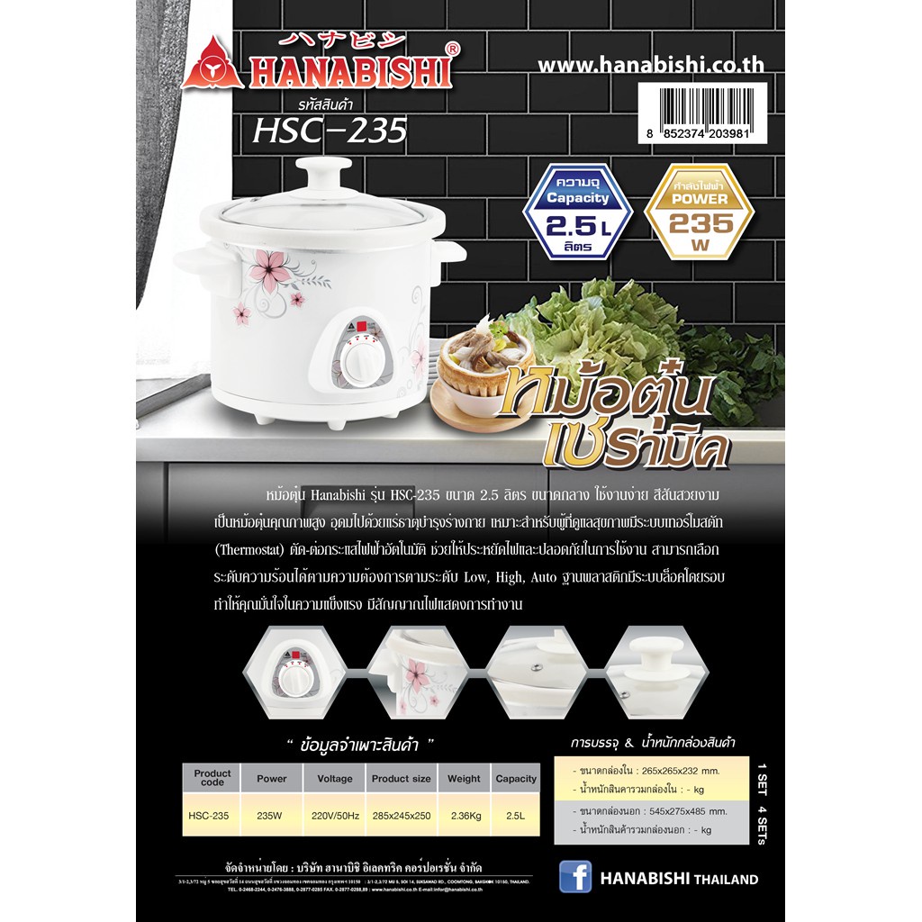 HANABISHI หม้อตุ๋น หม้อตุ๋นเซรามิค 2.5L รุ่น HSC-235 เซรามิค 235w หม้อตุ๋นไก่ หม้อตุ๋นยาจีน หม้อตุ๋นอาหาร หม้อตุ๋นโจ๊ก
