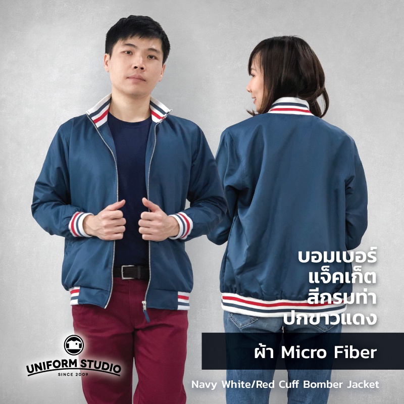 Uniform Studio เสื้อแจ็คเก็ต Jacket บอมเบอร์ สีกรมท่า ปกขาวแดง ผ้าไมโครไฟเบอร์