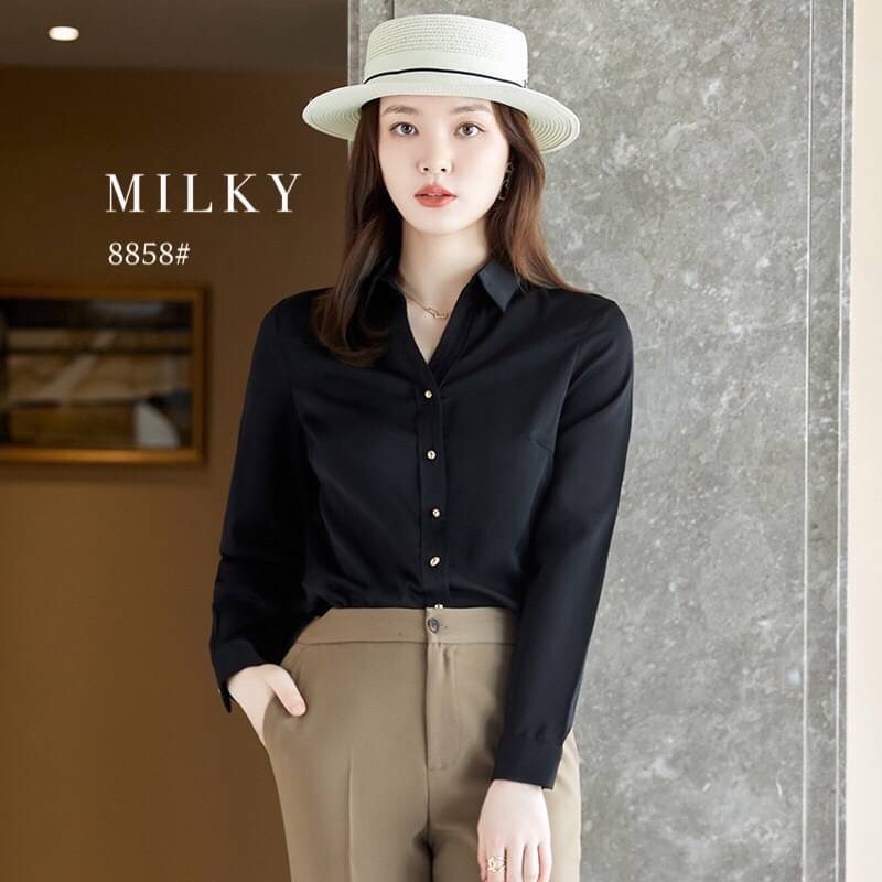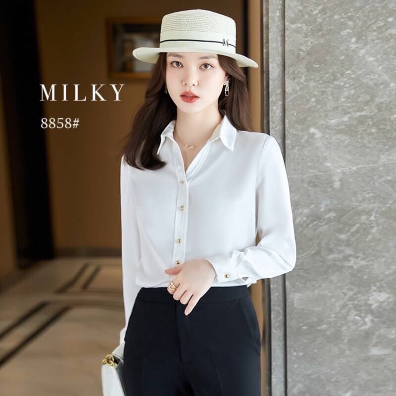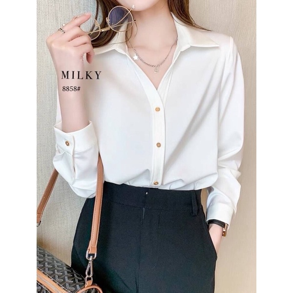 เสื้อทำงานผู้หญิงแขนยาว ออกแบบมีกระดุมทองข้างหน้า เนื้อผ้าชีฟอง เนื้อผ้านุ่มเบาใส่สบาย สไตล์คนทำงาน New Fashion 2026