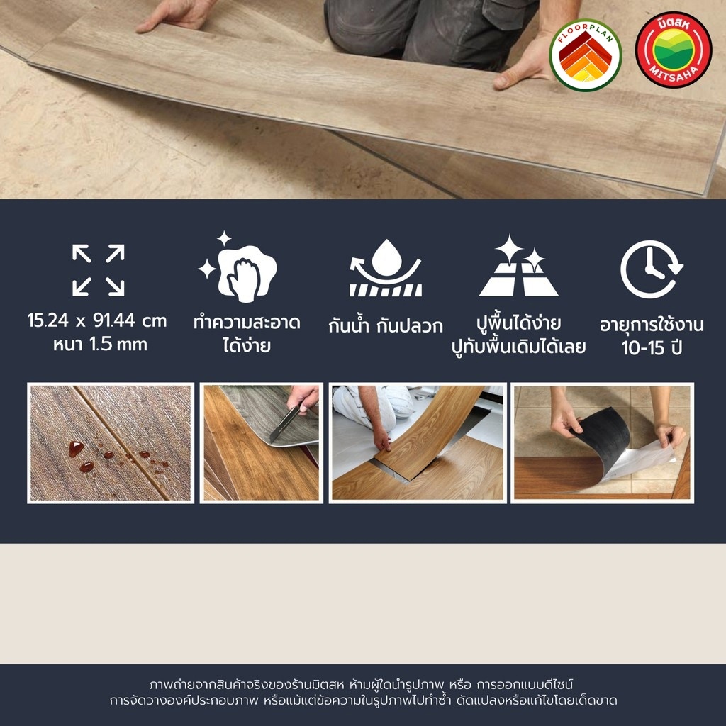 (35แผ่น/5ตรม.) กระเบื้องยาง กาวในตัว ลายไม้/หินอ่อน ยางปูพื้น 15.25x91.44 ซม. ติดตั้งง่าย SPC หนา 1.5 มิล Flooring มิตสห