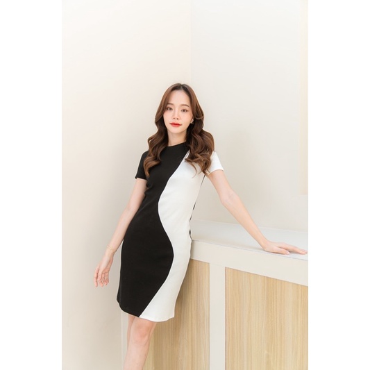 พร้อมส่ง/ส่งด่วน [เหลือ6xx.-ลด20%เก็บโค้ด"ร้านโค้ดคุ้ม"]Curve mini dress เดรสทูโทน มีแขน พรางหุ่น ชุดทำงาน ผ้ายืด ไหมพรม