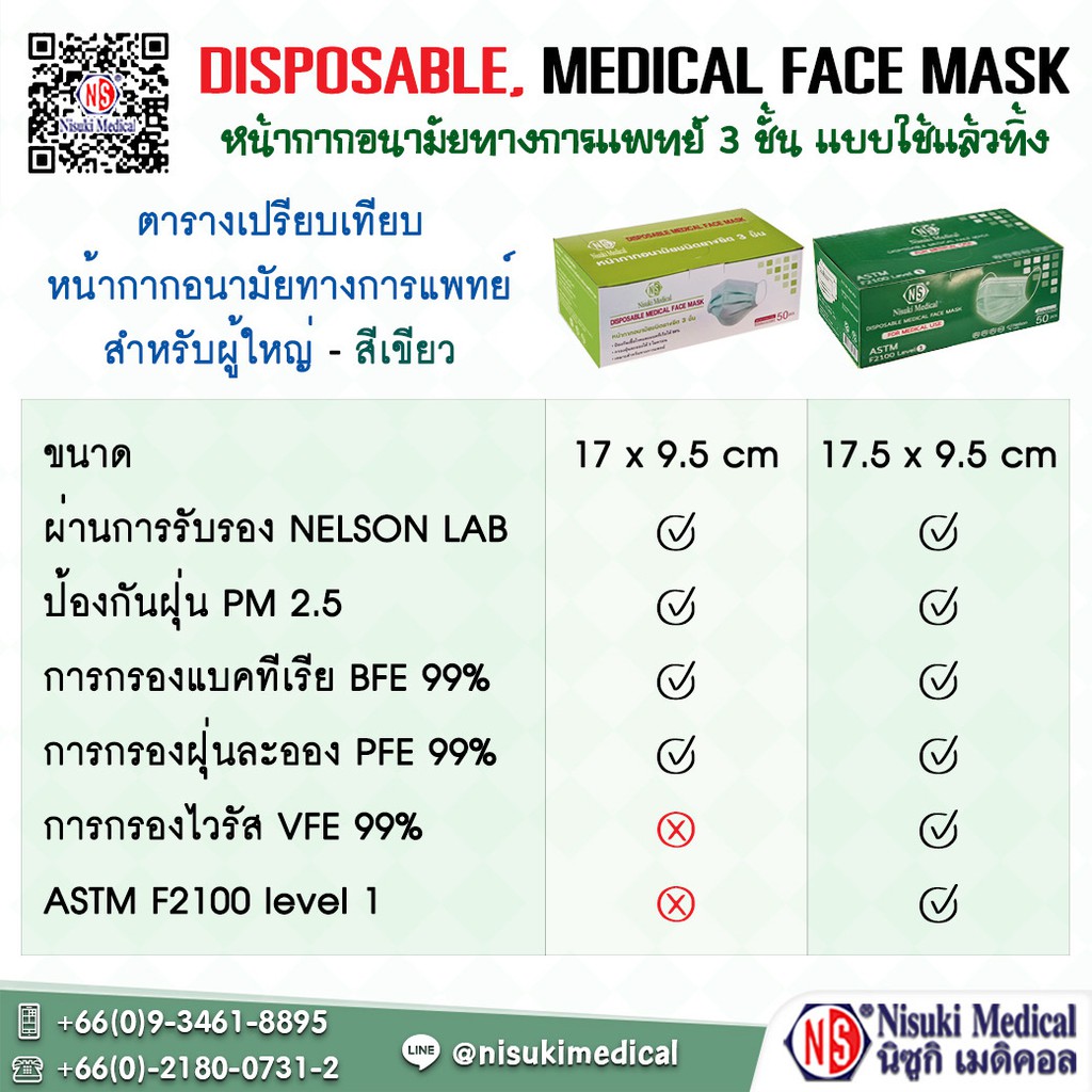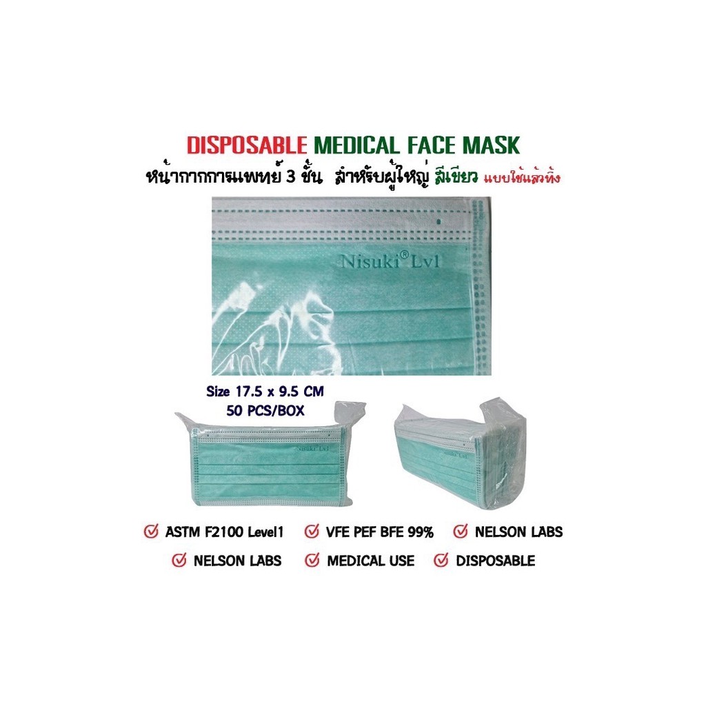 หน้ากากการแพทย์ 3 ชั้น สำหรับผู้ใหญ่ สีเขียว มี อย , นำเข้าจีน , BFE PPE VFE ,Nelson , F2100 Level 1
