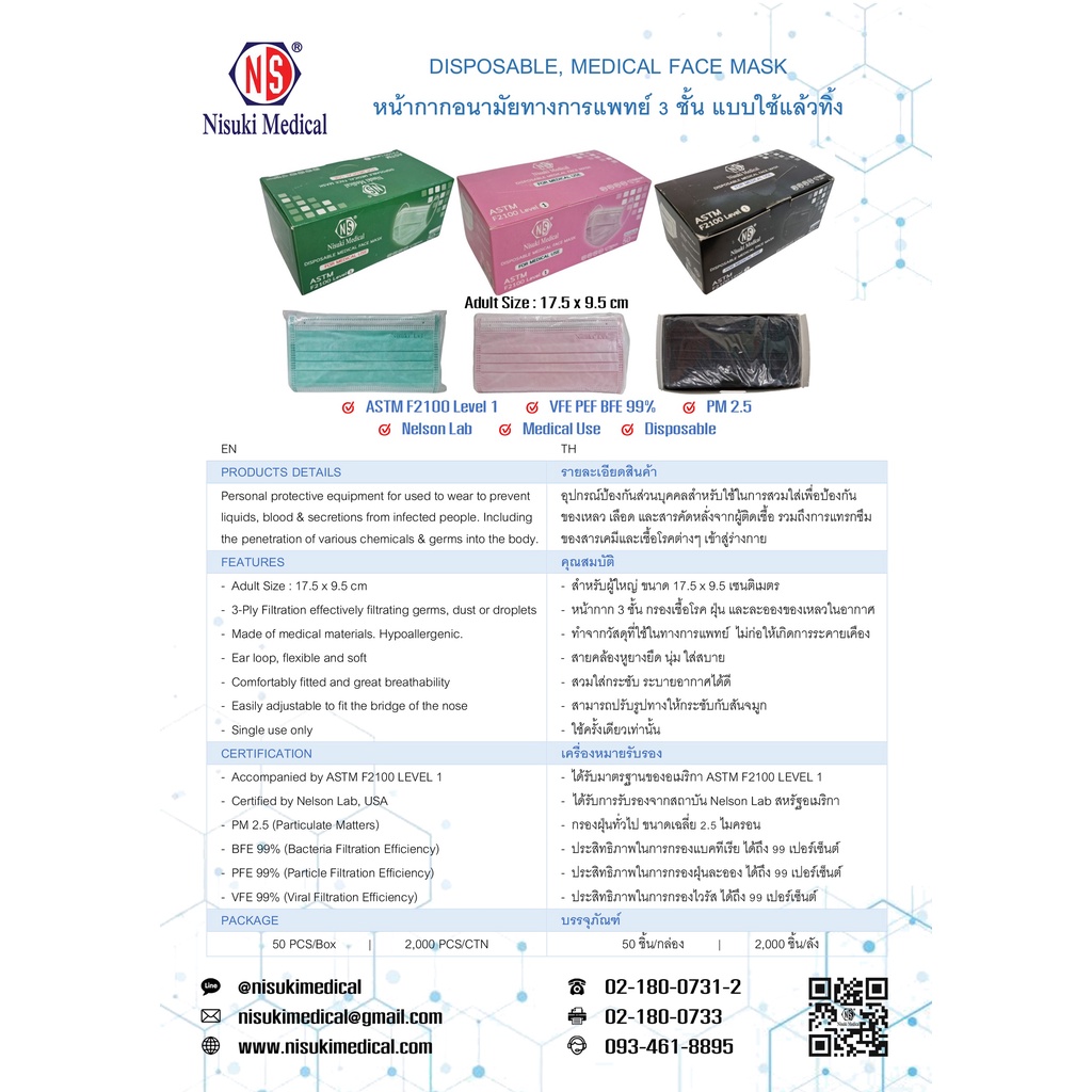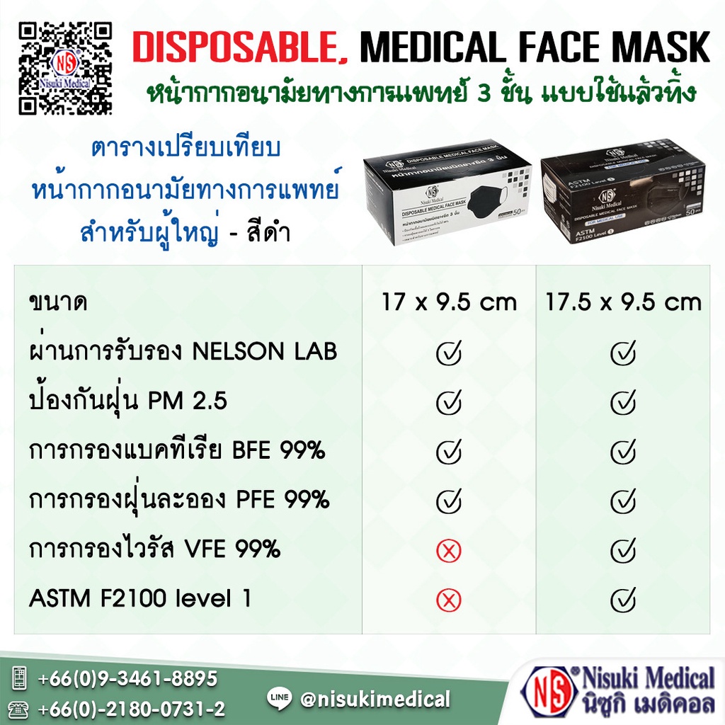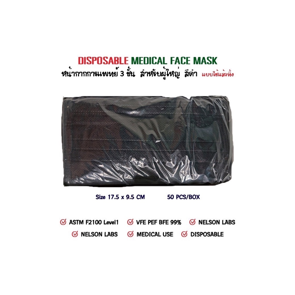 หน้ากากการแพทย์ 3 ชั้น สำหรับผู้ใหญ่ สีดำ มี อย , นำเข้าจีน , BFE PPE VFE ,Nelson , F2100 Level 1