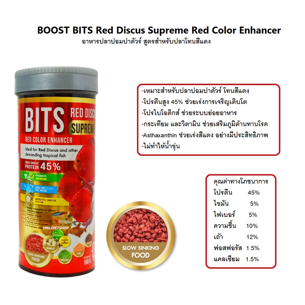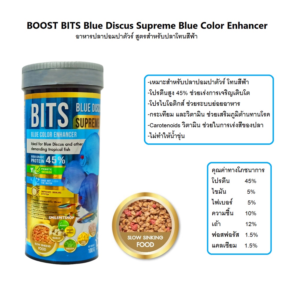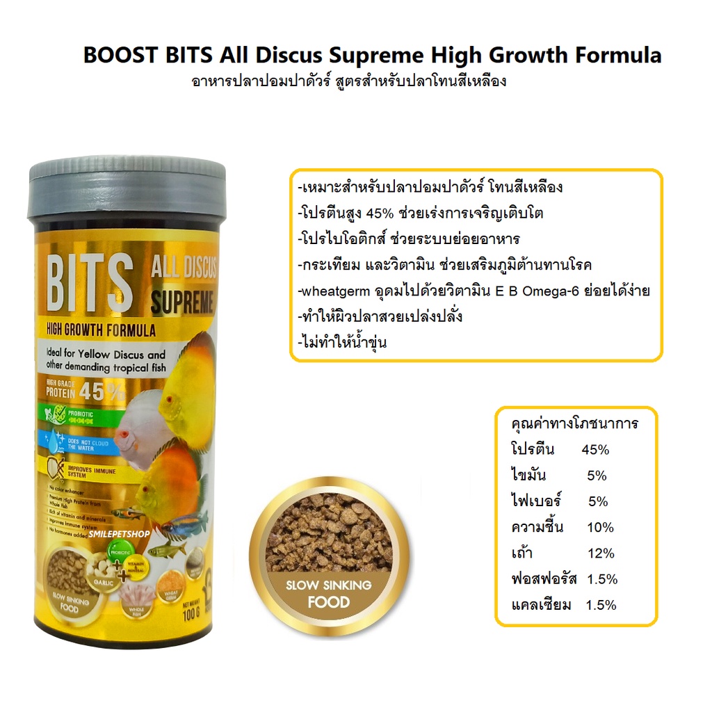 BOOST BITS DISCUS 100 g. (อาหารปลาปอมปาดัวร์ เร่งสี เร่งโต เสริมภูมิต้านทาน สูตรแยกตามสายพันธุ์ปลา)