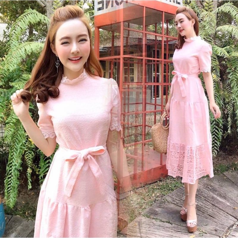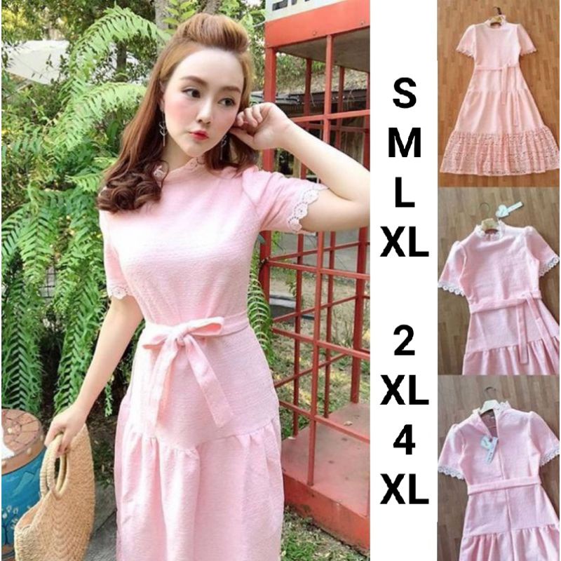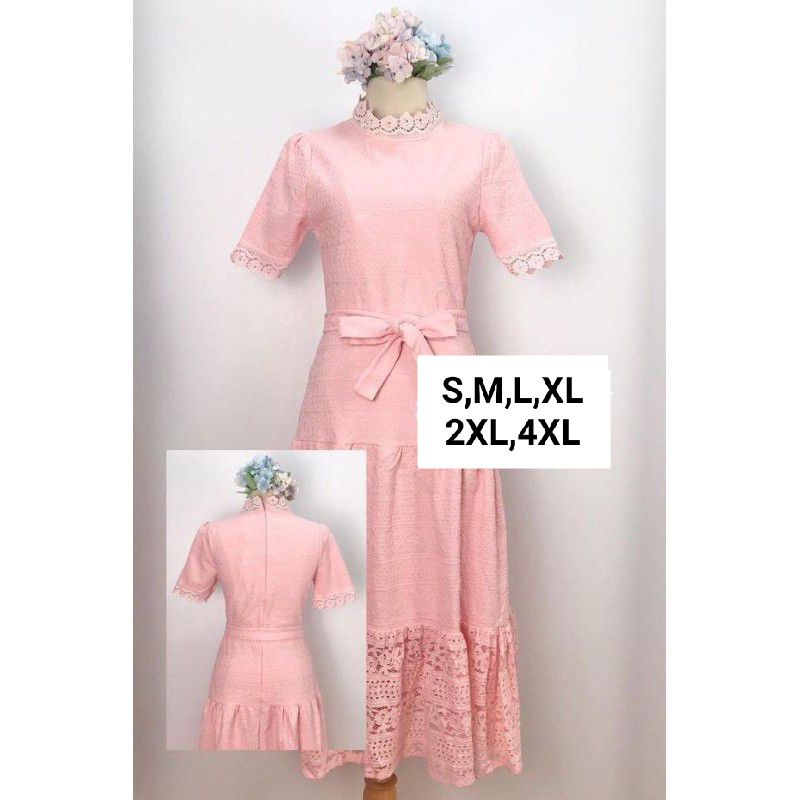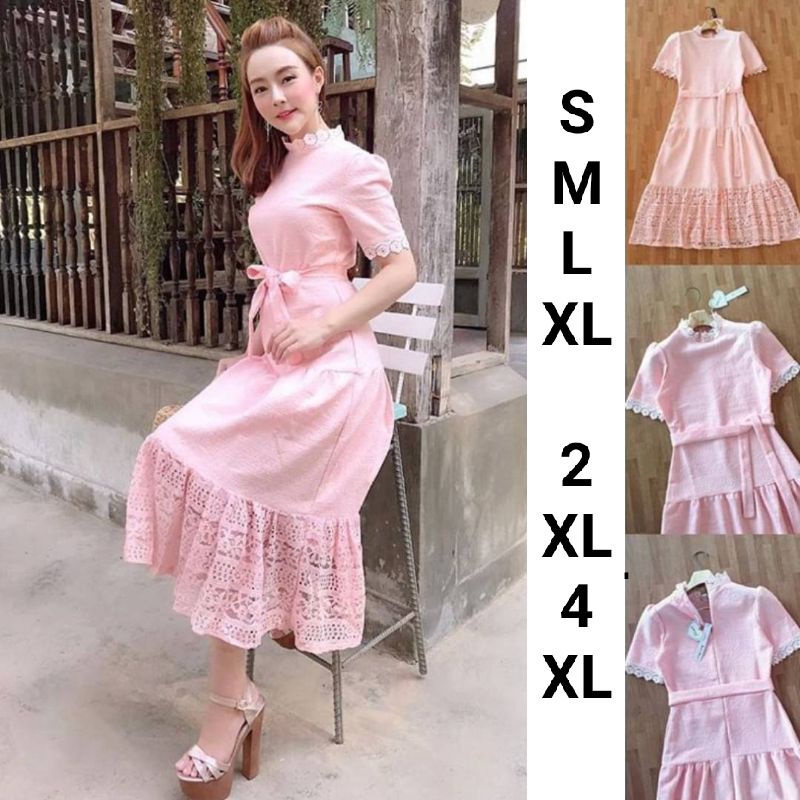 เดรสลูกไม้สีชมพูโอรส!!! S-4XL Dress ชุดเพื่อนเจ้าสาว,เดรสสีชมพูโอรสแขนสั้นผ้าลูกไม้ฉลุลาย+สายผูกเอว งานป้าย Love Love