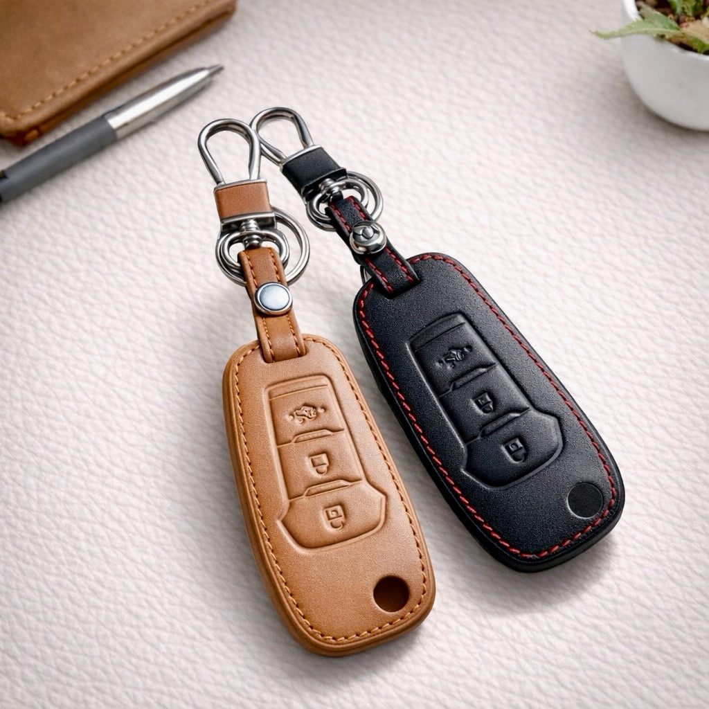 ซองหนังแท้ใส่กุญแจรีโมทรถยนต์ Ford Ranger,Everest 2015-21 รุ่นหนังนิ่ม โลโก้-ฟ้า