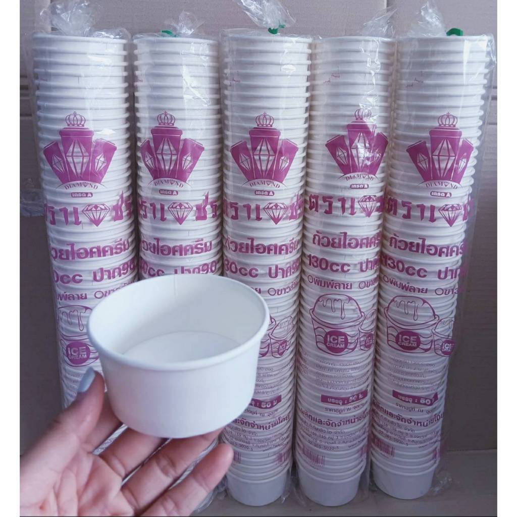 (ชุดละ 5 แพค) ถ้วยไอศครีม ถ้วยไอติม กระดาษ 130 cc. ปาก 90 mm. ขาวล้วน แพคละ 50 ใบ ตราเพชร