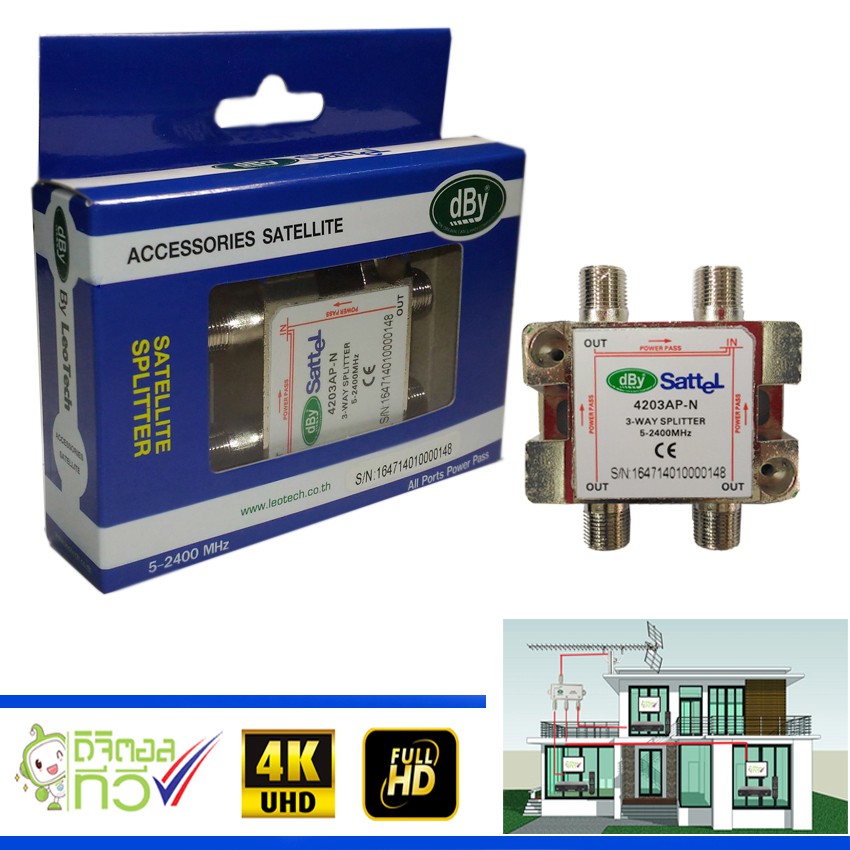dBy Splitter (น้ำเงิน) 1 x 3 Satellite All Port Power Pass 3way รองรับทีวีดิจิตอล แพ็ค 10