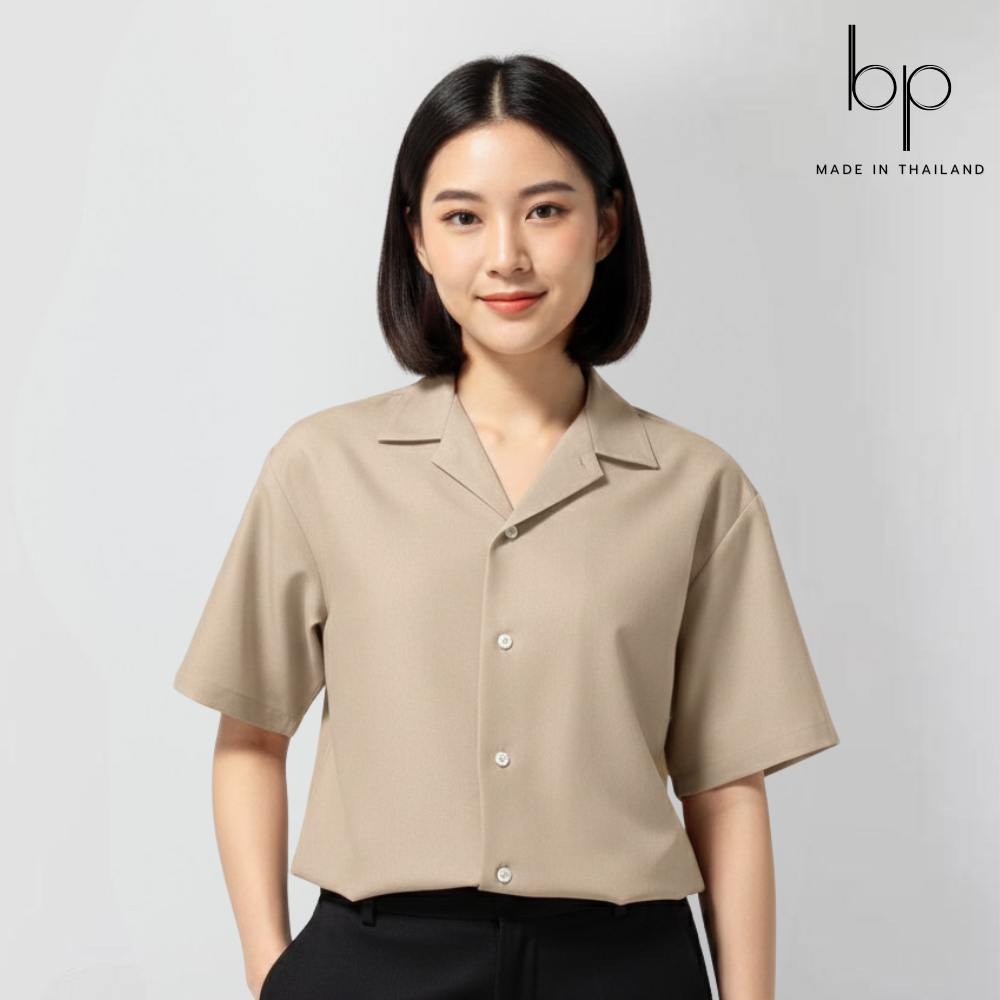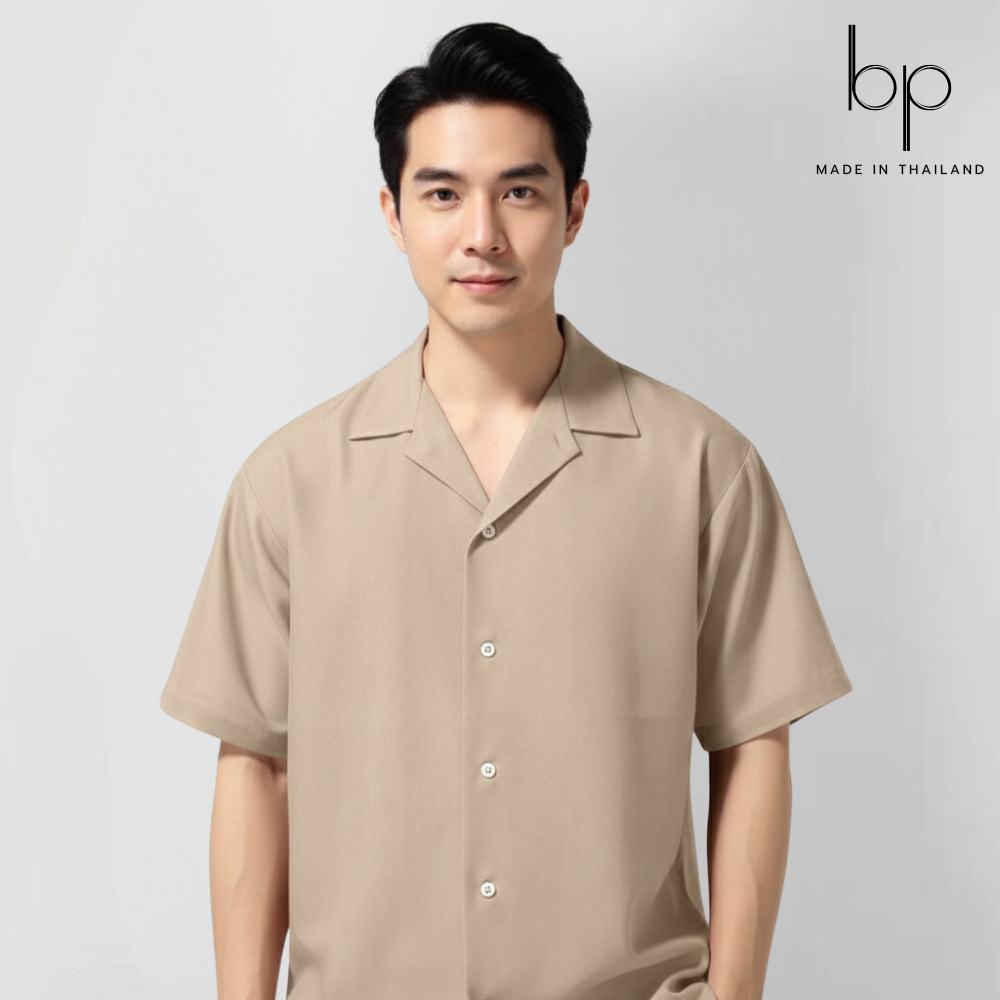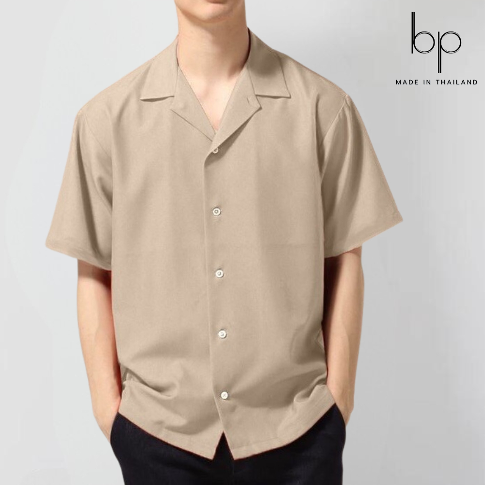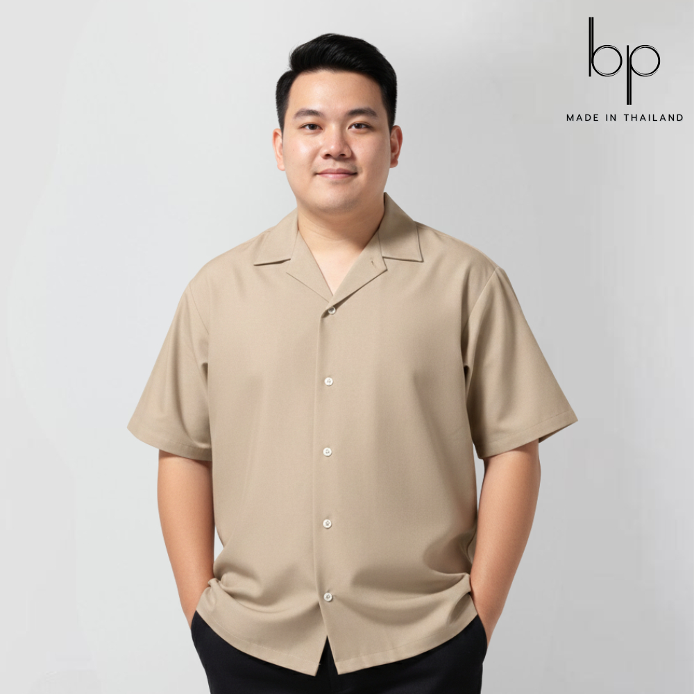 unisex🇰🇷เสื้อเชิ้ตแขนสั้น สีเบจ ทรงโอเวอร์ไซส์สไตล์เกาหลี ผ้าไหมอิตาลี(size M-6XL)