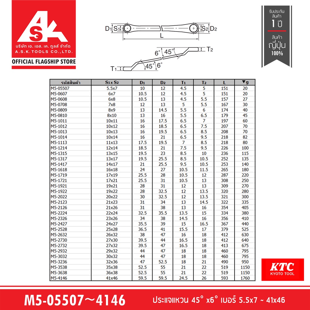 KTC TOOL ประแจแหวน 45° x6° รหัสสินค้า M5-05507 ~ M5-2427