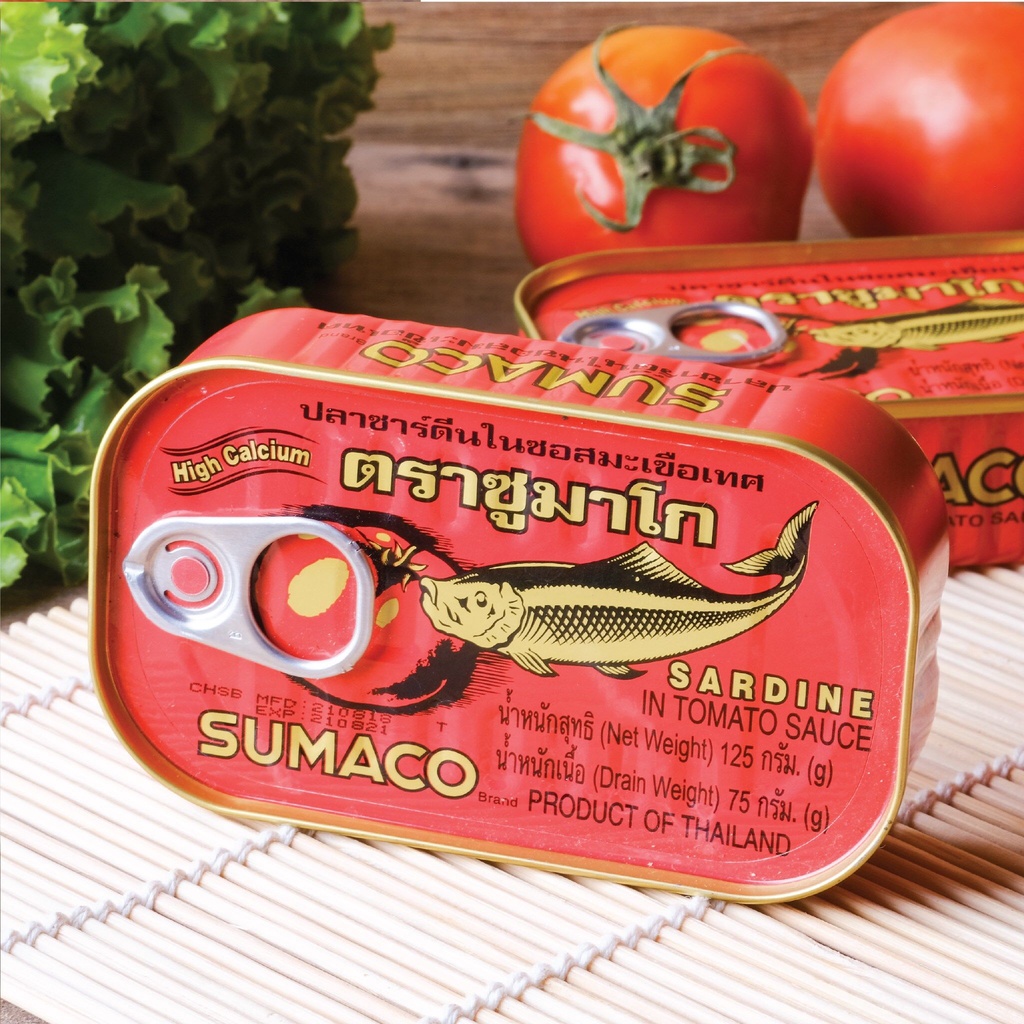 ( 1 กระป๋อง ) ซูมาโก ปลาซาร์ดีนในซอสมะเขือเทศ 125กรัม ปลากระป๋อง Sumaco แจ่วปลาร้า น้ำพริกปลาร้า แม่บุญล้ำ