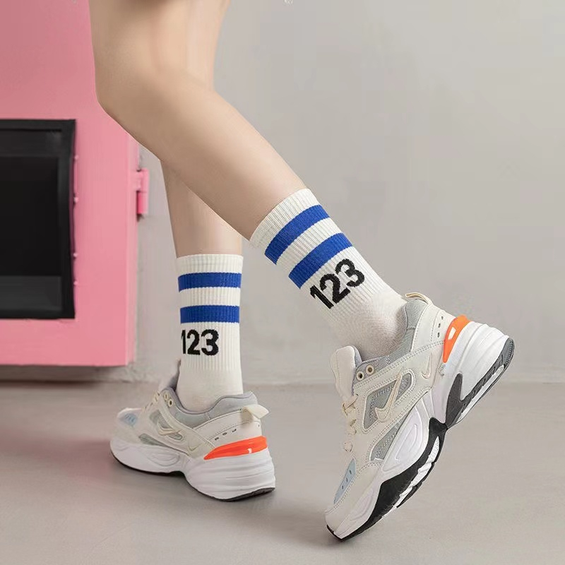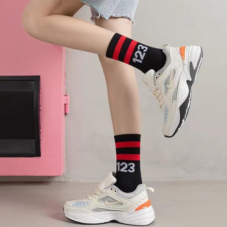 ถุงเท้ากีฬาบาสเก็ตบอล ลายขวาง สองแถบ แฟชั่นฮิปสเตอร์ สตรีท สำหรับทุกเพศSports socks digital fashion women's socks