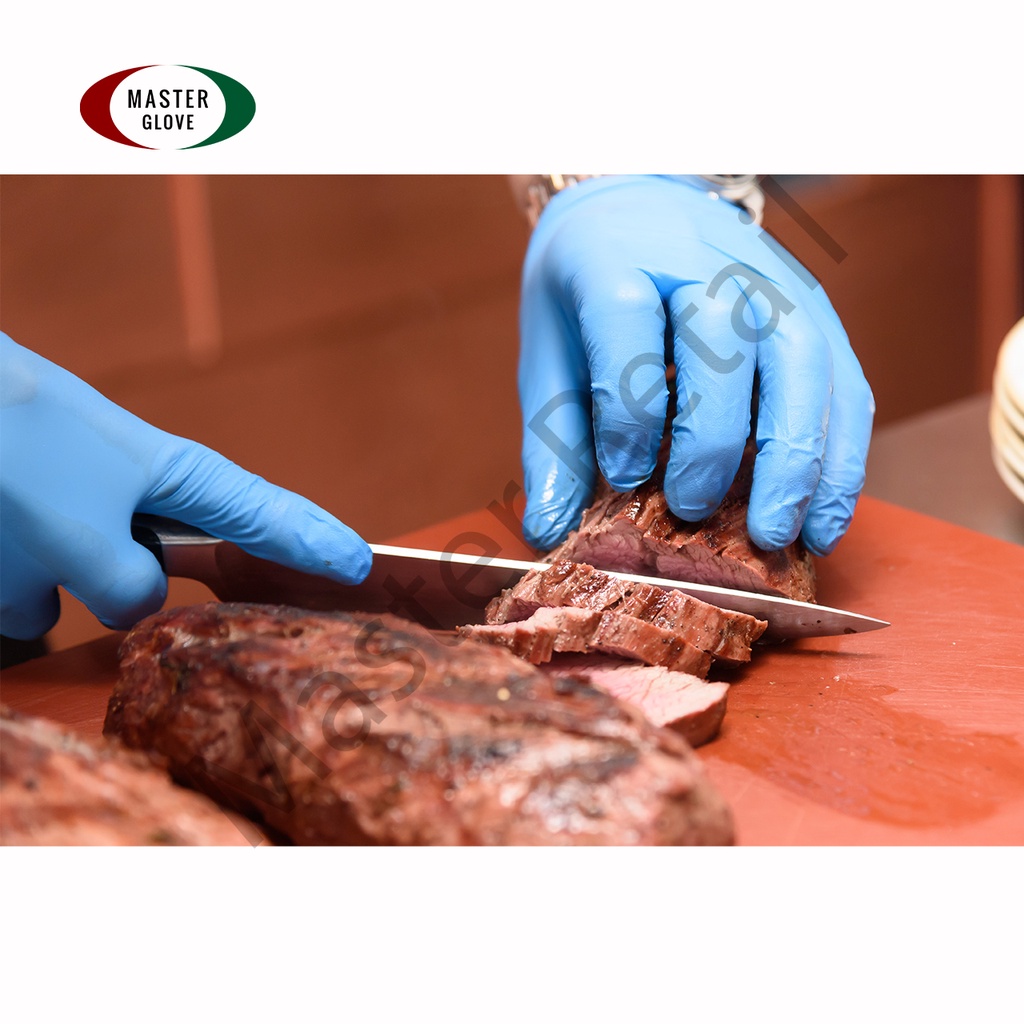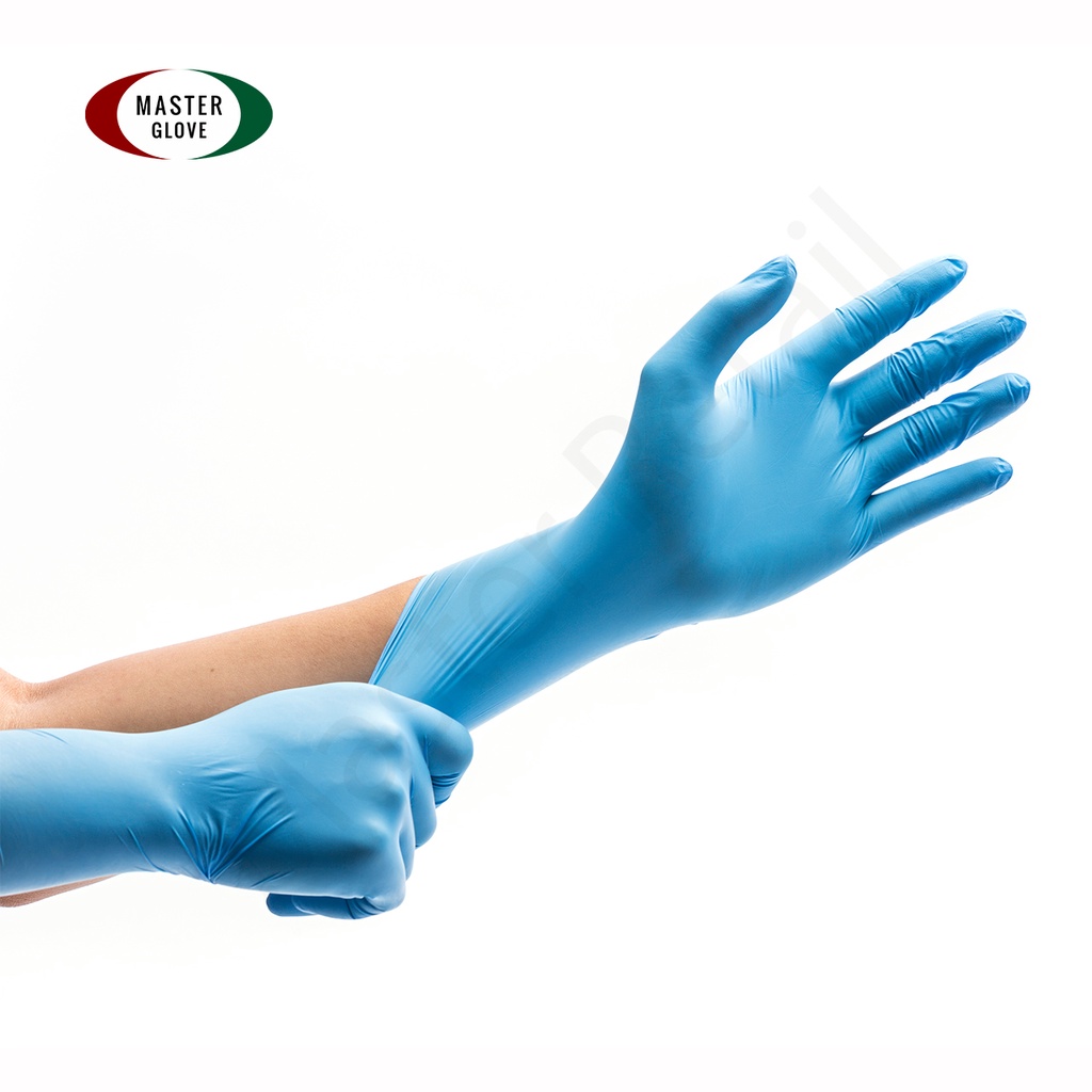 Master Glove ถุงมือไนไตร สีฟ้า หนา 5.0 รุ่นหนาพิเศษ ทนเคมี ไม่มีแป้ง (Food Safe) 100 ชิ้น/50 คู่