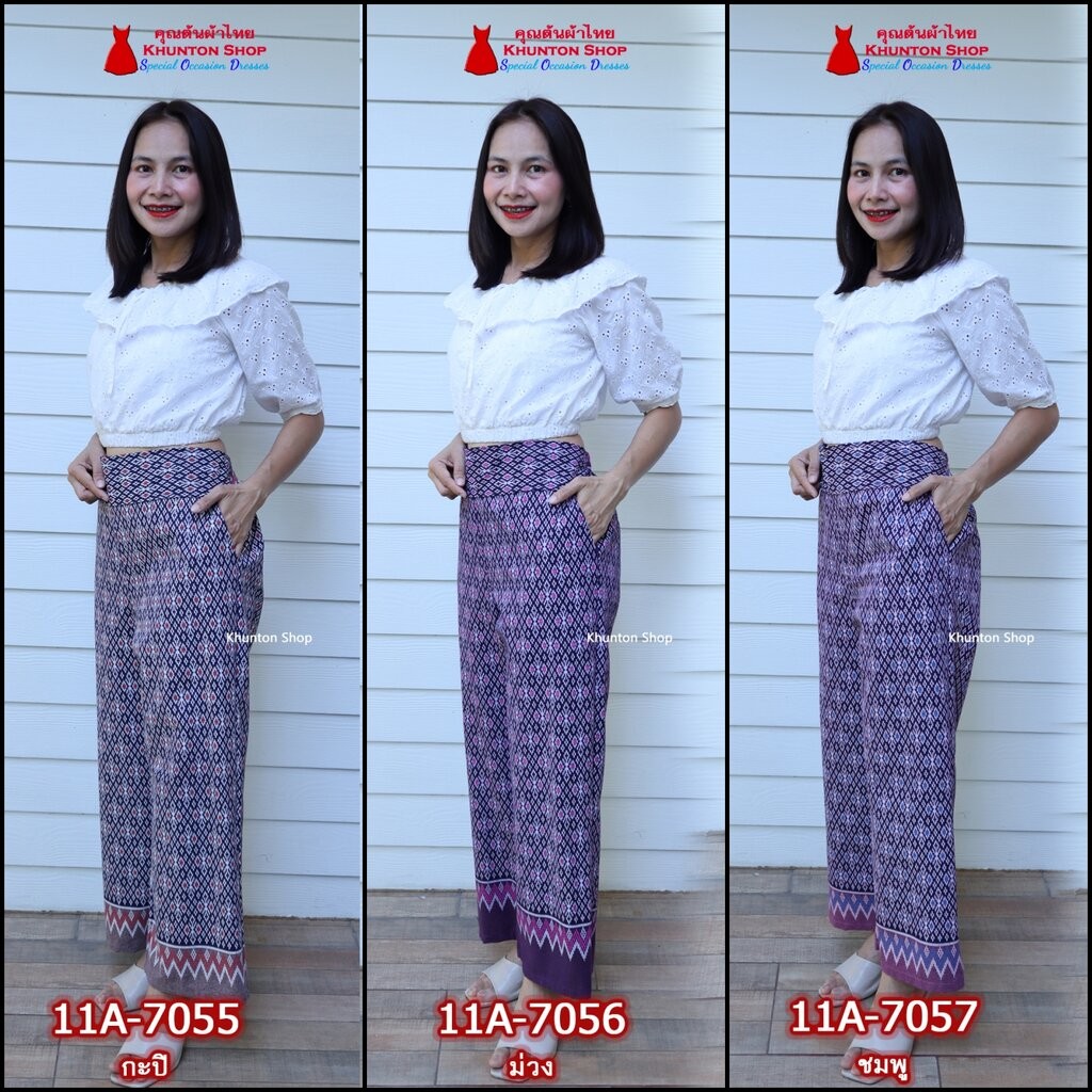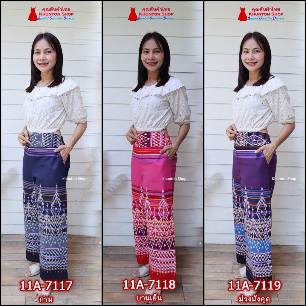 11A-02 กางเกงผ้าไทย ผ้าฝ้ายพิมพ์ลาย กางเกงทรงคุณนาย ขาตรง เอว 28-46 เอวยืดสม็อคหลัง มีกระเป๋าสองข้าง