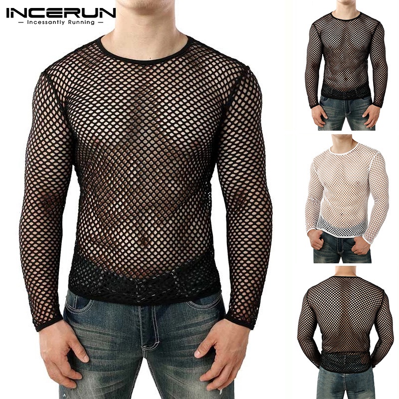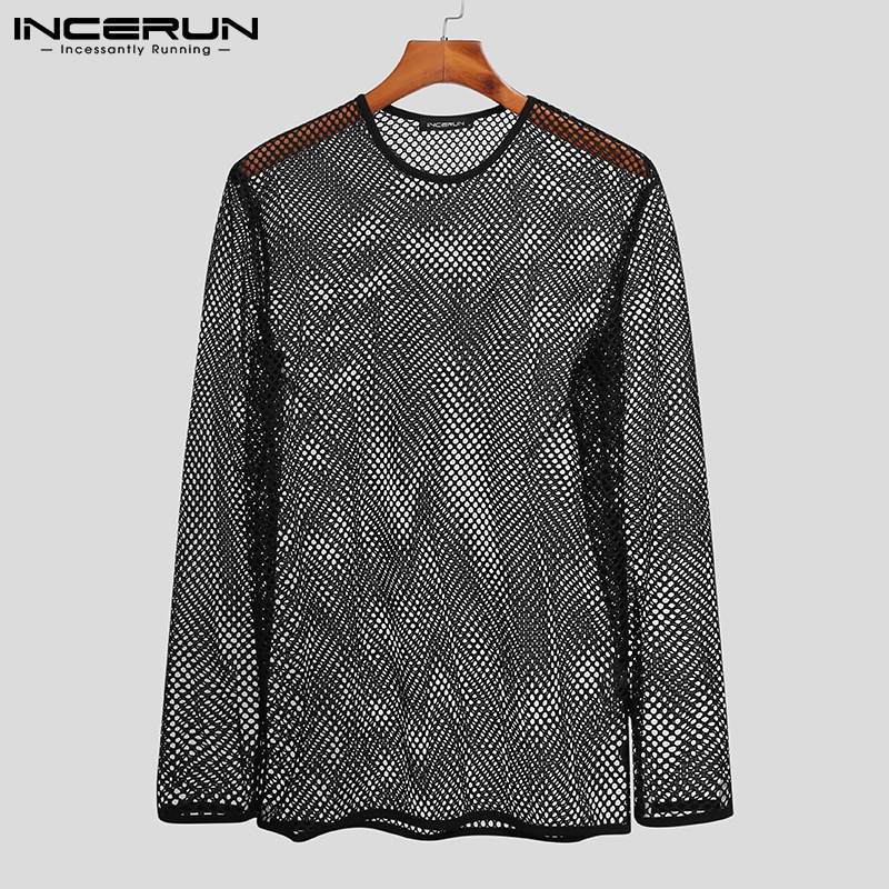 Incerun แฟชั่นเสื้อท็อปแขนยาวสลิมฟิตผ้าตาข่ายซีทรูสําหรับผู้ชาย