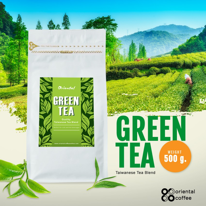 ชาเขียว ใบชาบด 100% Oriental Green Tea ชาเขียวไต้หวันผสมดอกมะลิแห้งหอมกลิ่นมะลิเบาๆสีเขียวไม่เข้มมาก