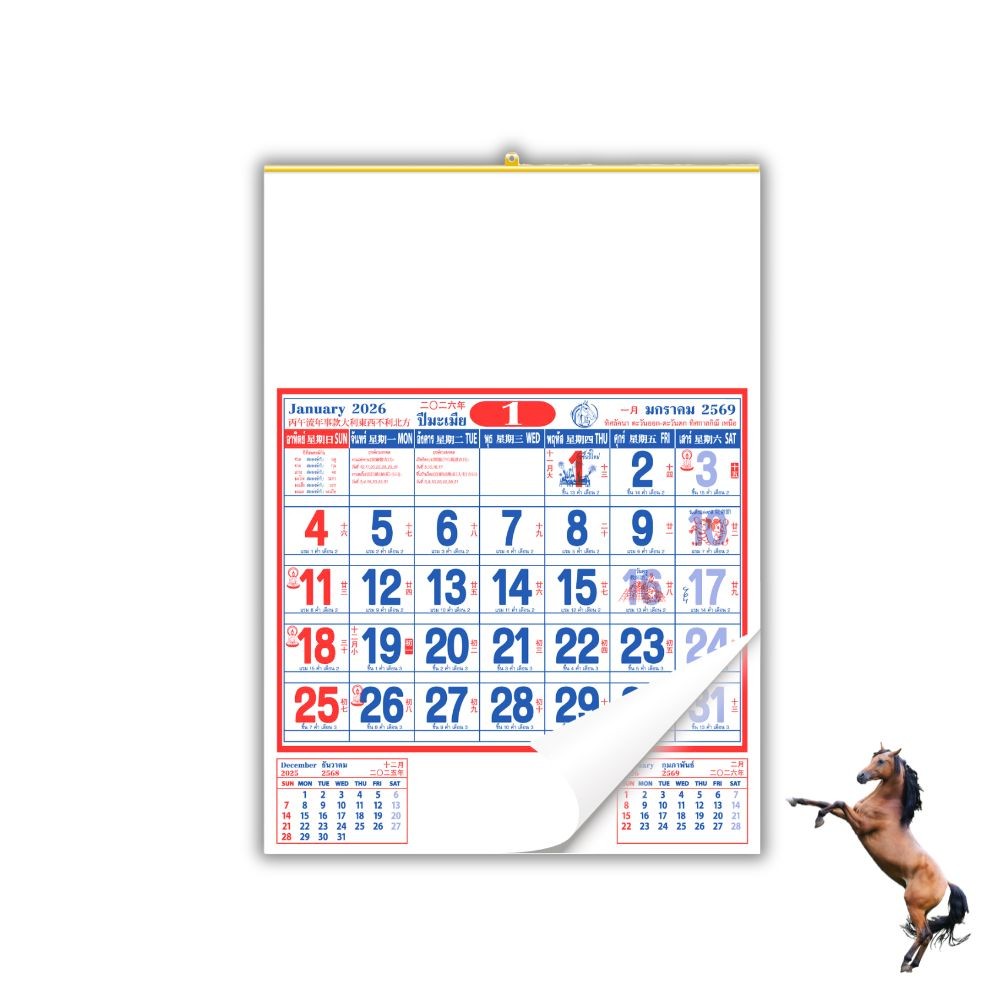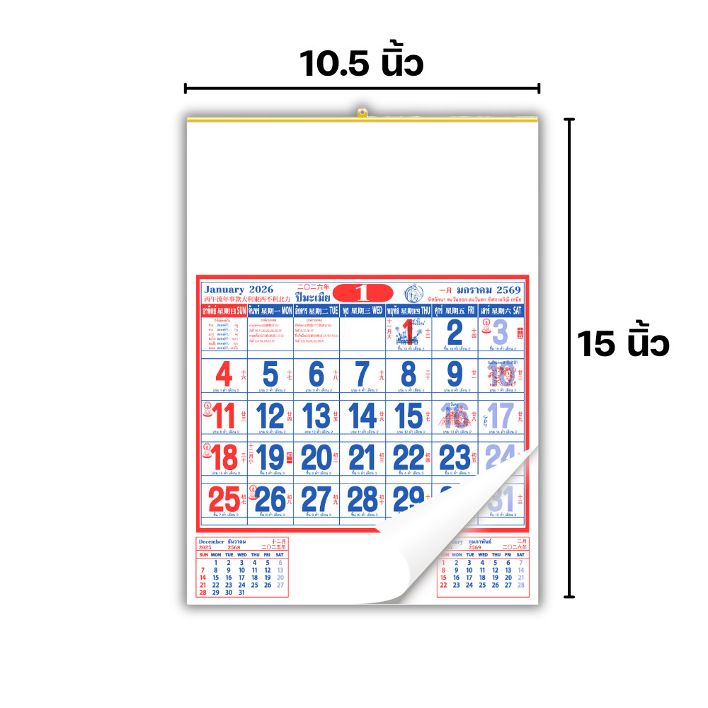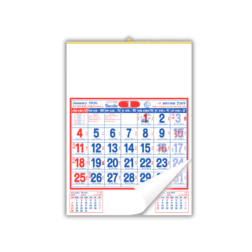 ปฏิทินแขวนจีน ปฏิทินจีน 2569 Calendar 2026 มีฤกษ์ยามมงคล มีใบ้เลข พร้อมวันหยุด จดโน๊ตได้