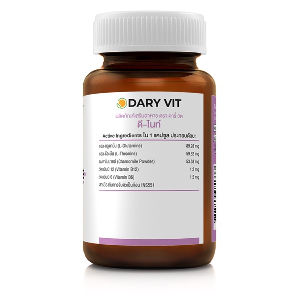 Dary Vit D Nite ดารี่วิท ดีไนท์ อาหารเสริม สกัดจากดอกคาโมมายด์ แอลกลูตามีน แอลธีอะนีน 1 กระปุก (30 แคปซูล)