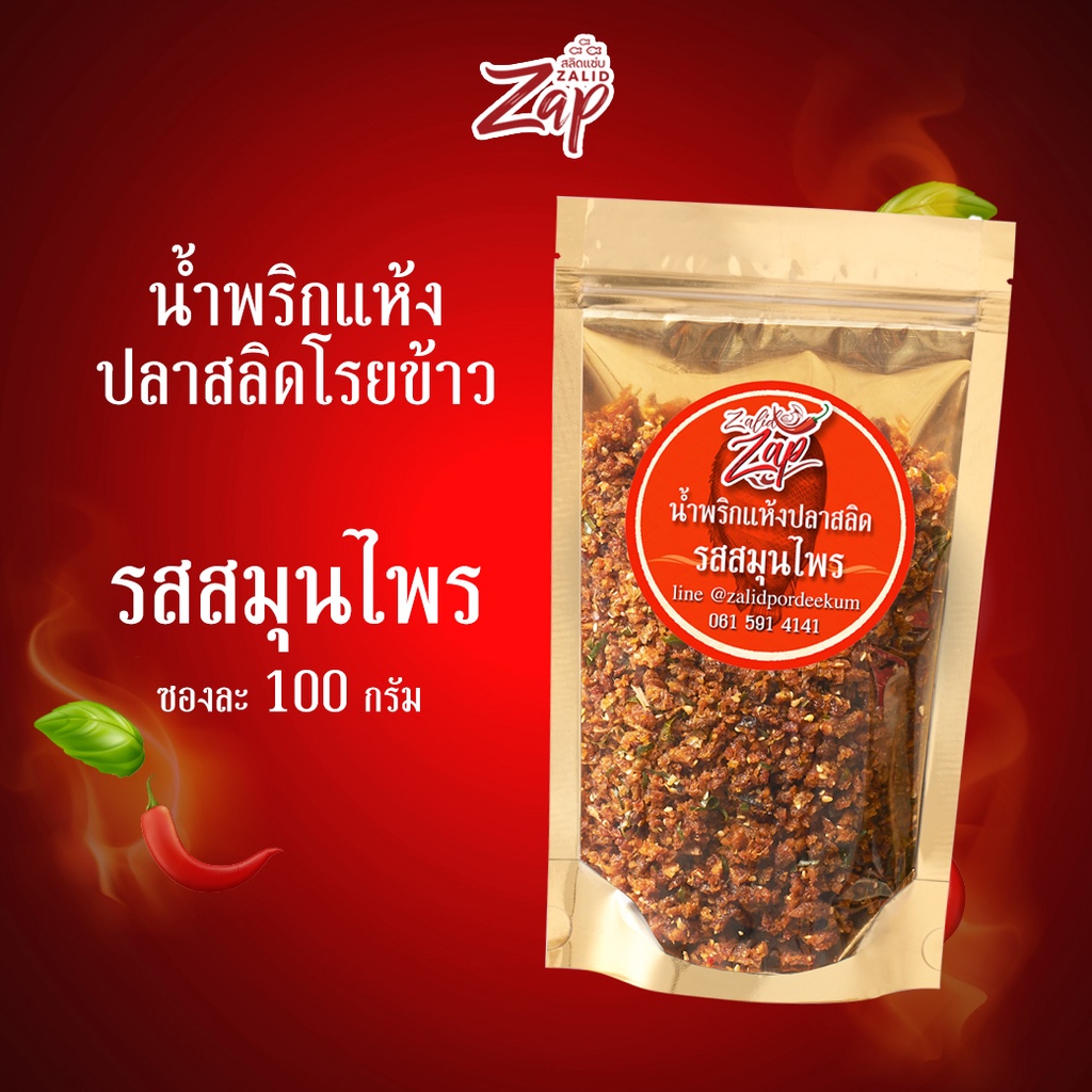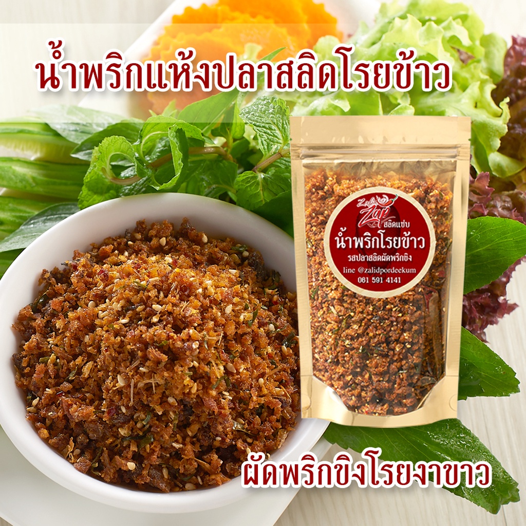 น้ำพริกแห้งปลาสลิดโรยข้าว รสผัดพริกขิง รสสมุนไพร รสน้ำพริกนรก แบบซอง ขนาด 100 กรัม 3 รสชาติ 1 ซอง Zalidpordeekum