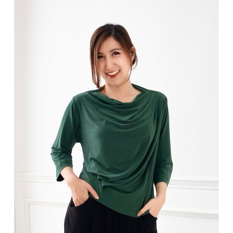 MEREDITH - Jenny Top เสื้อแขนสามส่วนคอปีน ดีไซน์จับเดรปเฉียงจากบ่าไปเอวอีกด้าน