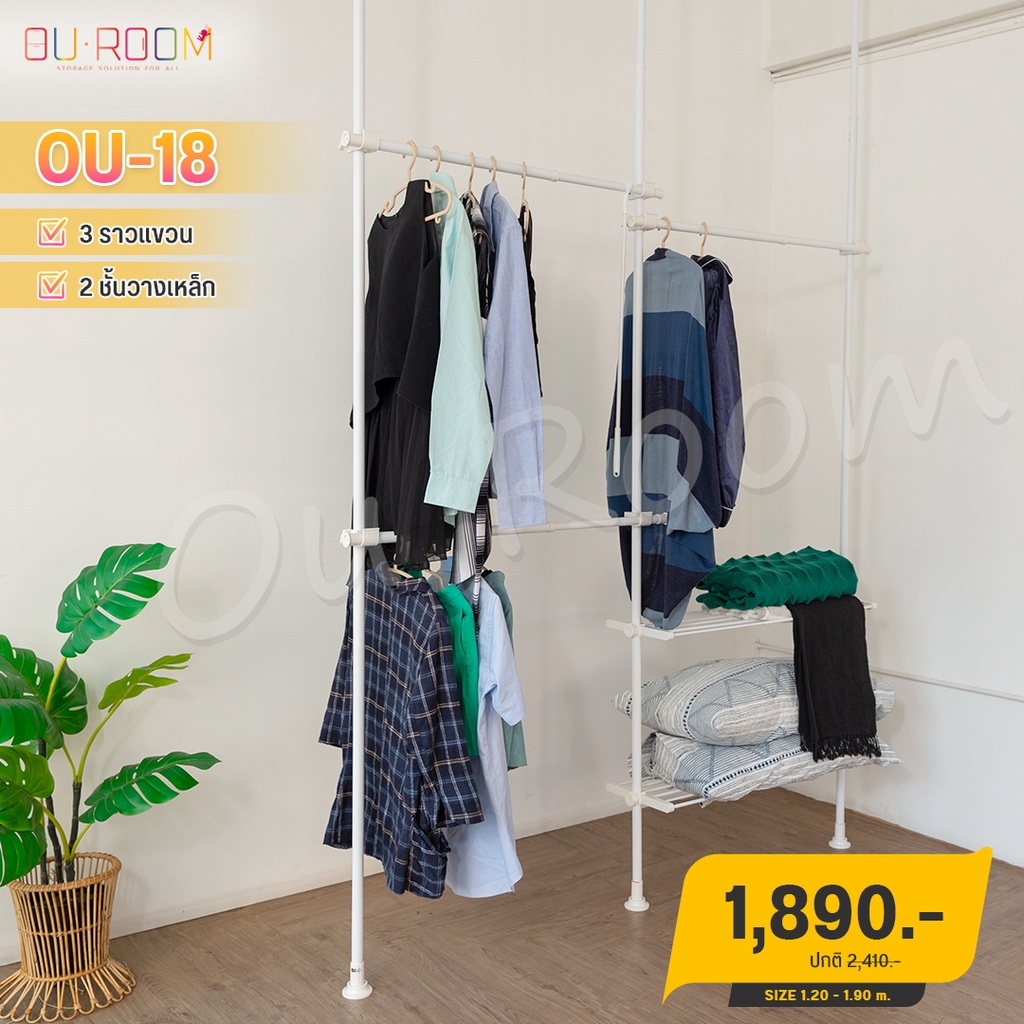OUROOM ราวแขวนเสื้อ ราวแขวนผ้า ราวแขวนไม่ต้องเจาะ ราวแขวน DIY 3 เสา 3 ราวแขวน 2 ชั้นวางเหล็ก (OU-18)