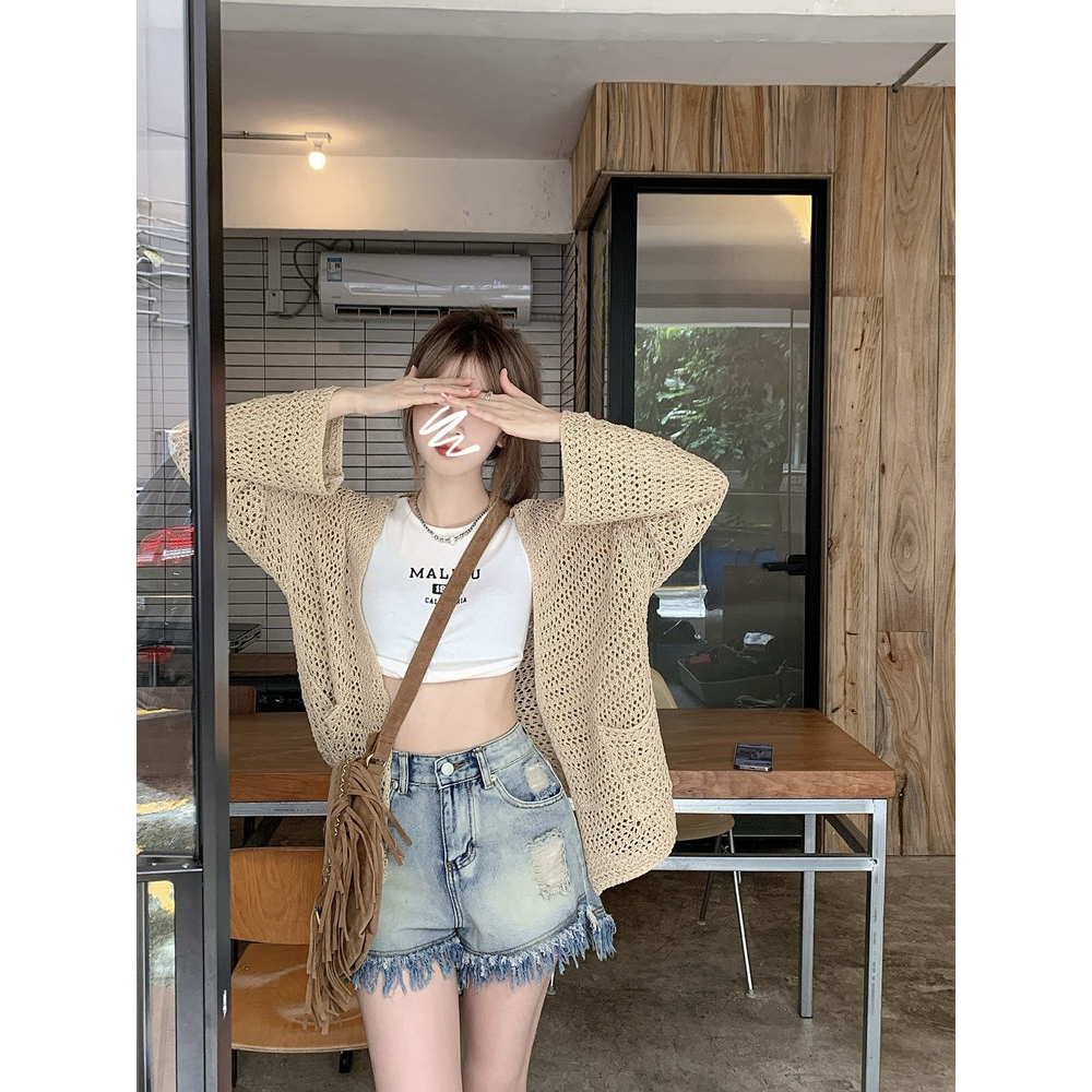 Cicishop(1100/Z5488)เสื้อคลุมแขนยาว ผ้าตาข่าย แต่งดีเทลกระเป๋าหน้าสองข้างใช้งานได้จริง