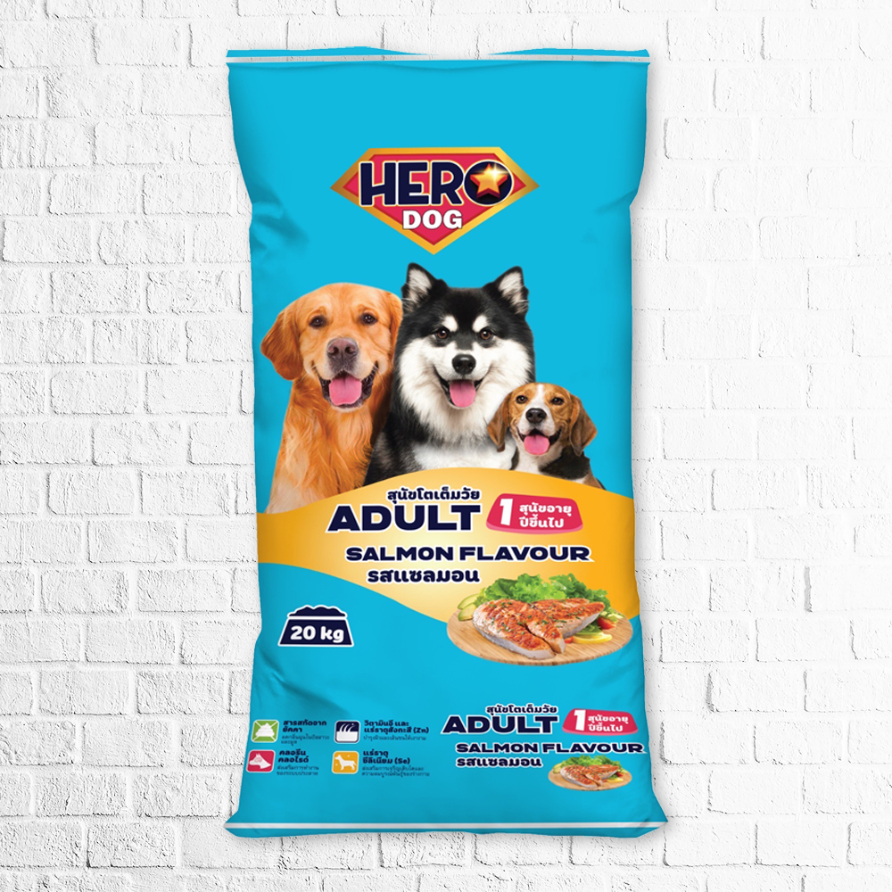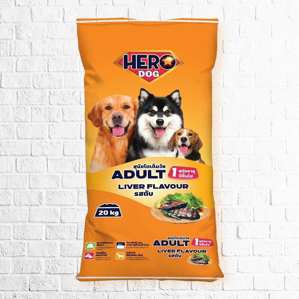 อาหารสุนัขโต Hero Dog ขนาด 20 กก. และ 10 กก. รสเนื้อ รสตับและรสแซลมอน