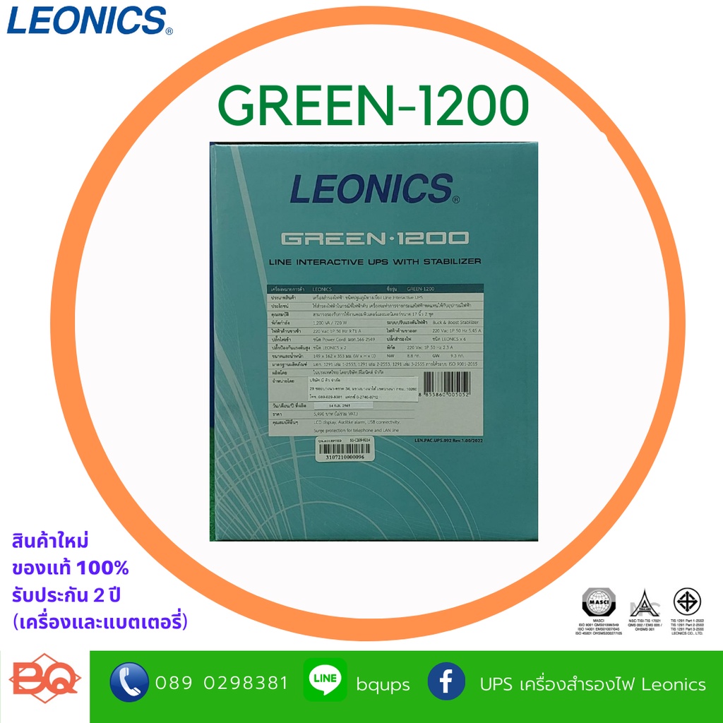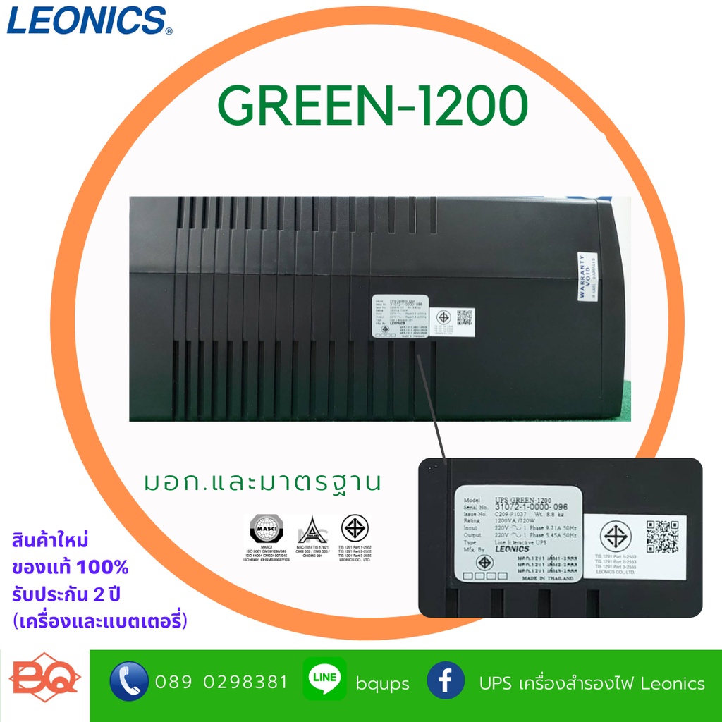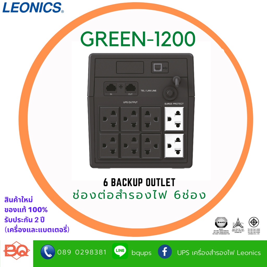 เครื่องสำรองไฟฟ้า ลีโอนิคส์ LEONICS UPS รุ่น GREEN-1200 1200VA 720 วัตต์ มอก.1291-2553 รับประกัน 2ปี