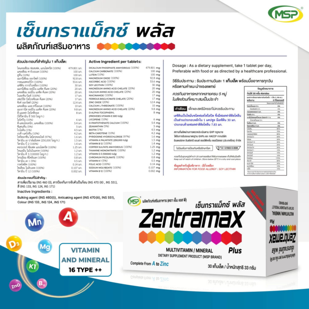 MSP เซ็นทราแม็กซ์ พลัส I Zentramax Plus I Tablet 30 แคปซูล วิตามิน เกลือแร่ 23 ชนิด วัย 50+ #13276